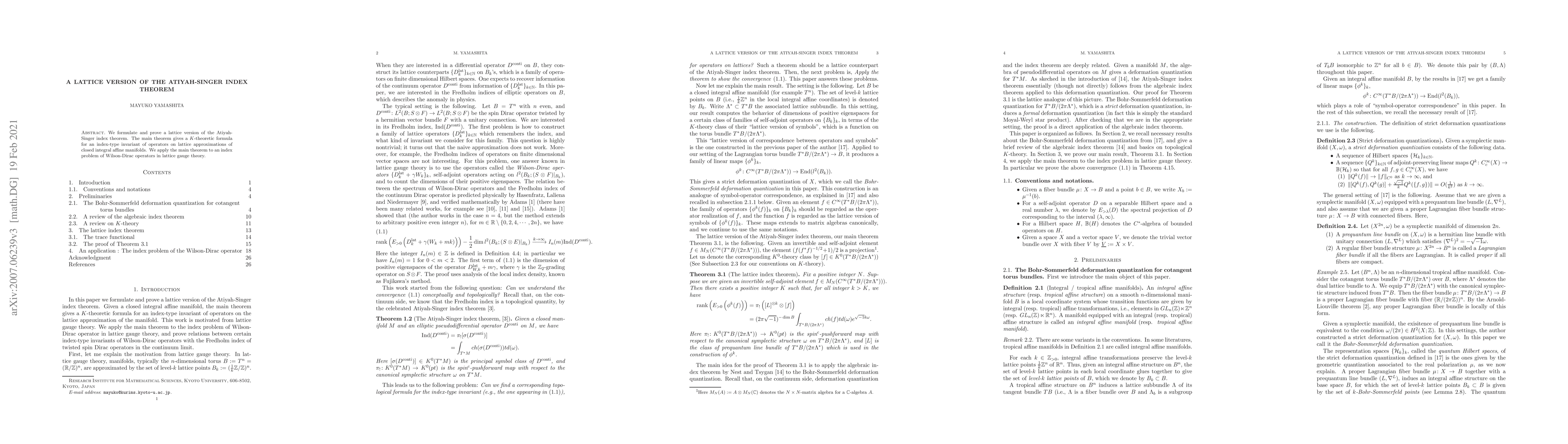 This paper formulates and proves a lattice version of the Atiyah-Singer index theorem, providing a $K$-theoretic formula for an index-type invariant of operators on lattice approximations of closed integral affine manifolds. The theorem is applied to address an index problem of Wilson-Dirac operators in lattice gauge theory.