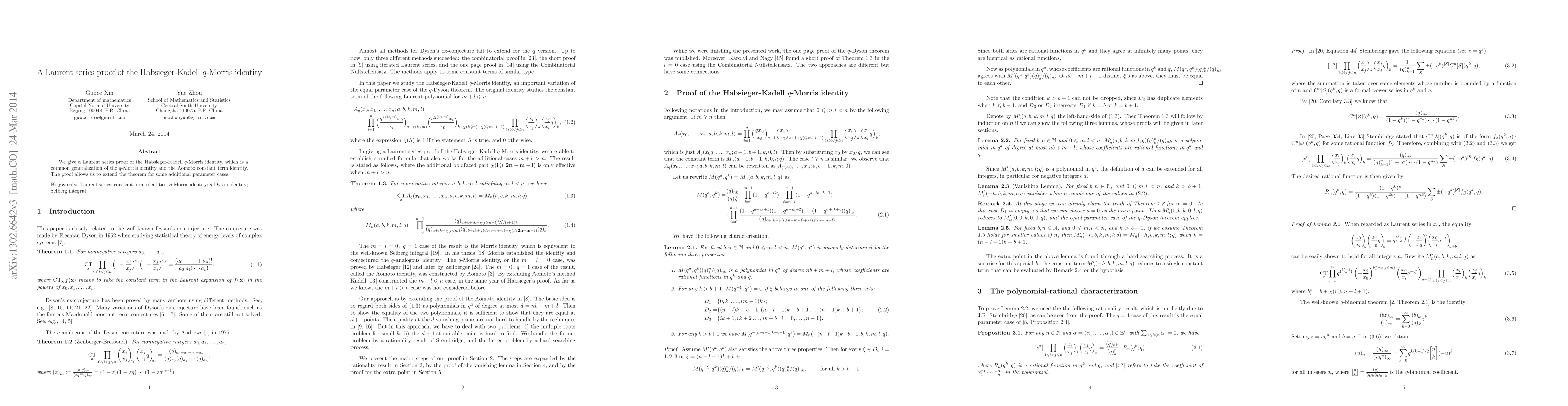 This paper presents a Laurent series proof for the Habsieger-Kadell $q$-Morris identity, generalizing both the $q$-Morris identity and the Aomoto constant term identity, and extends the theorem to additional parameter cases.