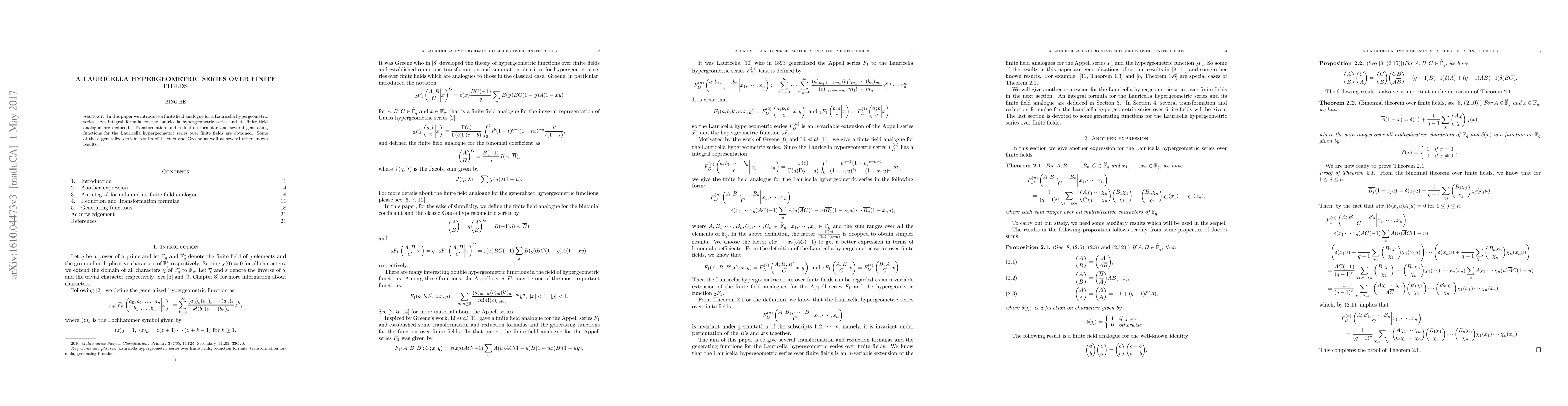 This paper introduces a finite field analogue of the Lauricella hypergeometric series, deriving integral, transformation, and reduction formulae, and generating functions for it. These results generalize previous findings by Li et al, Greene, and other known results.