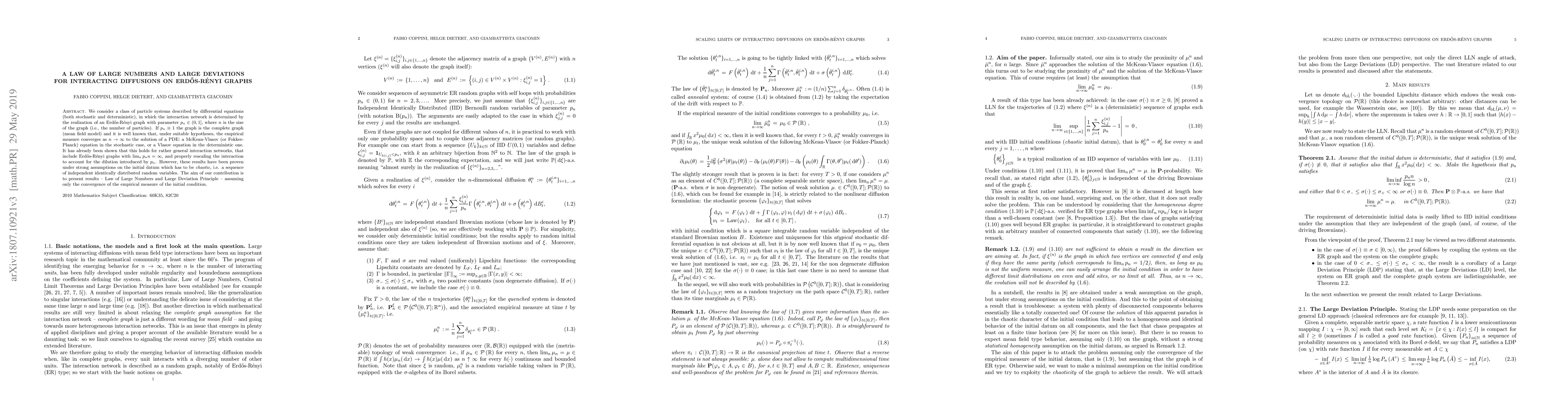 We consider a class of particle systems described by differential equations (both stochastic and deterministic), in which the interaction network is determined by the realization of an Erd\H{o}s-R\'enyi graph with parameter $p_n\in (0, 1]$, where $n$ is the size of the graph (i.e., the number of particles). If $p_n\equiv 1$ the graph is the complete graph (mean field model) and it is well known that, under suitable hypotheses, the empirical measure converges as $n\to \infty$ to the solution of a PDE: a McKean-Vlasov (or Fokker-Planck) equation in the stochastic case, or a Vlasov equation in the deterministic one. It has already been shown that this holds for rather general interaction networks, that include Erd\H{o}s-R\'enyi graphs with $\lim_n p_n n =\infty$, and properly rescaling the interaction to account for the dilution introduced by $p_n$. However, these results have been proven under strong assumptions on that initial datum which has to be chaotic, i.e. a sequence of independent identically distributed random variables. The aim of our contribution is to present results -- Law of Large Numbers and Large Deviation Principle -- assuming only the convergence of the empirical measure of the initial condition.