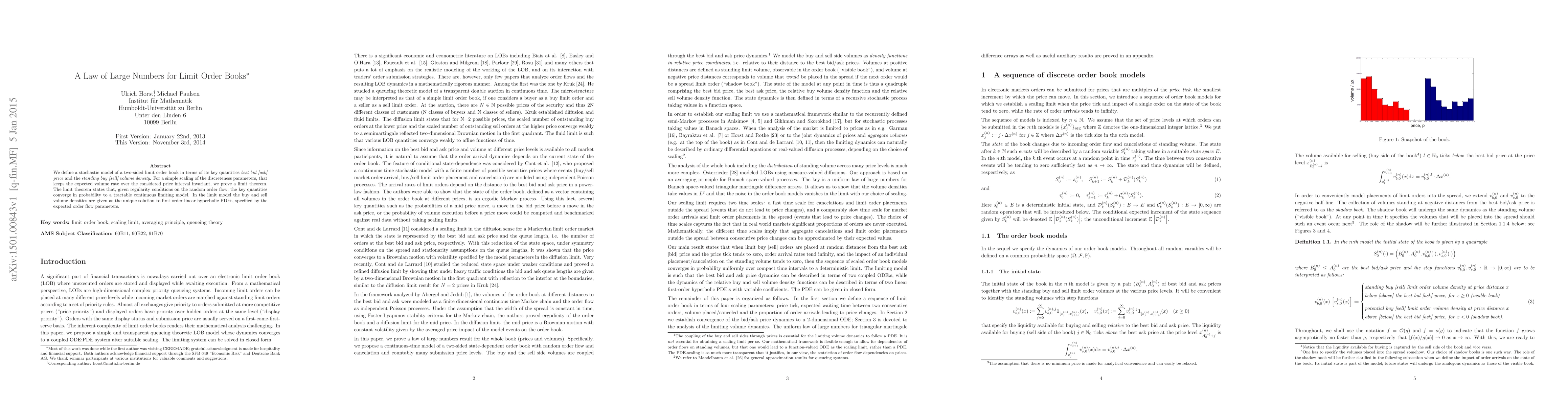 We define a stochastic model of a two-sided limit order book in terms of its key quantities \textit{best bid [ask] price} and the \textit{standing buy [sell] volume density}. For a simple scaling of the discreteness parameters, that keeps the expected volume rate over the considered price interval invariant, we prove a limit theorem. The limit theorem states that, given regularity conditions on the random order flow, the key quantities converge in probability to a tractable continuous limiting model. In the limit model the buy and sell volume densities are given as the unique solution to first-order linear hyperbolic PDEs, specified by the expected order flow parameters.
