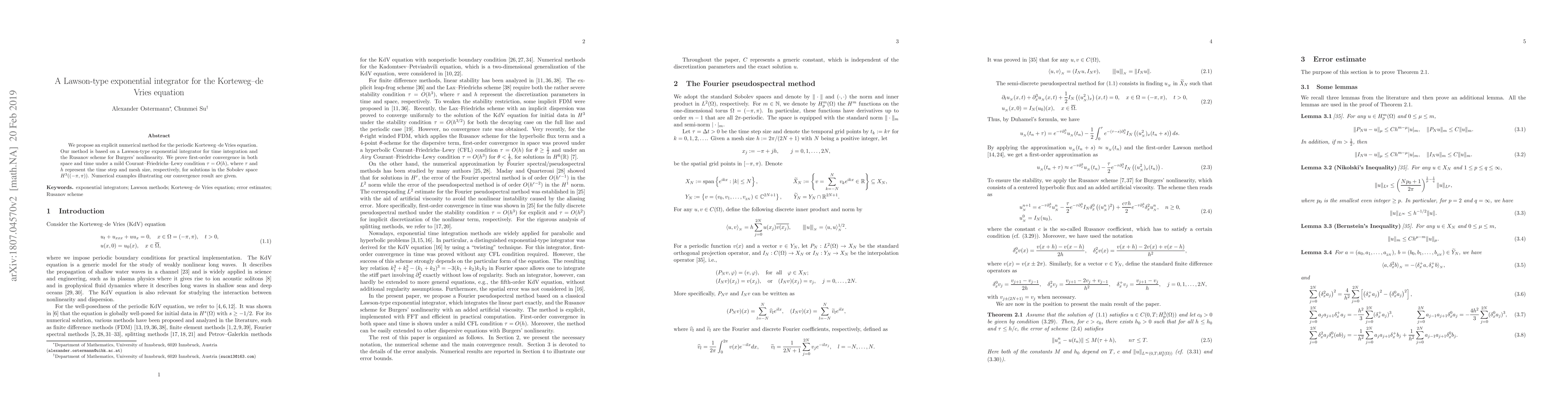 This paper proposes an explicit numerical method using a Lawson-type exponential integrator for solving the periodic Korteweg-de Vries equation, combining it with the Rusanov scheme for nonlinearity. The method demonstrates first-order convergence in space and time under a mild Courant-Friedrichs-Lewy condition.