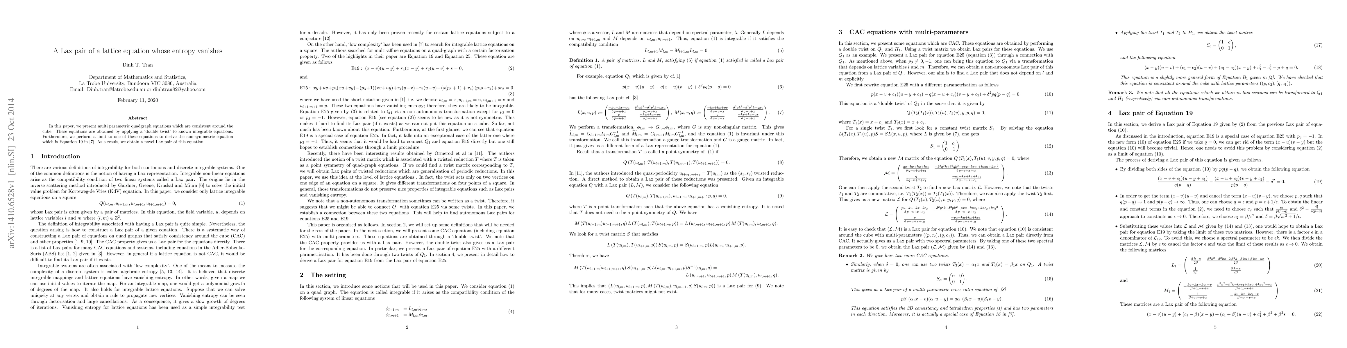 This paper introduces multi-parametric quadgraph equations derived from known integrable equations via a "double twist," leading to a novel Lax pair for the non-symmetric equation proposed by Hietarinta and Viallet. The entropy of these lattice equations is shown to vanish.