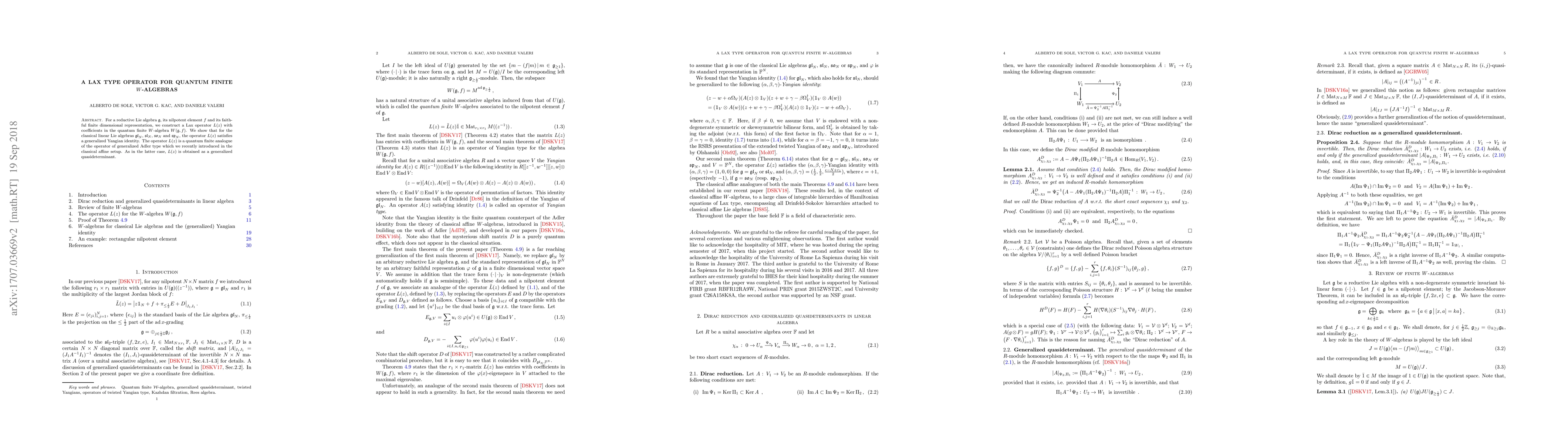 This paper constructs a Lax operator L(z) for quantum finite W-algebras associated with reductive Lie algebras, showing it satisfies a generalized Yangian identity for classical linear Lie algebras. The operator L(z) is a quantum analogue of a classical generalized Adler type operator, derived via a generalized quasideterminant.