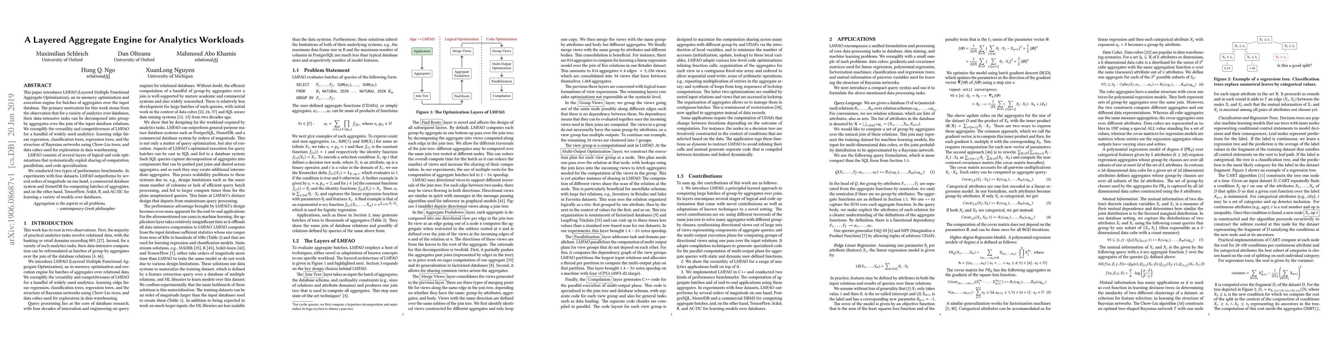 This paper presents LMFAO, an in-memory optimization engine for analytics workloads, which decomposes data-intensive tasks into group-by aggregates. LMFAO outperforms commercial database systems and machine learning frameworks in various benchmarks, demonstrating significant performance improvements.