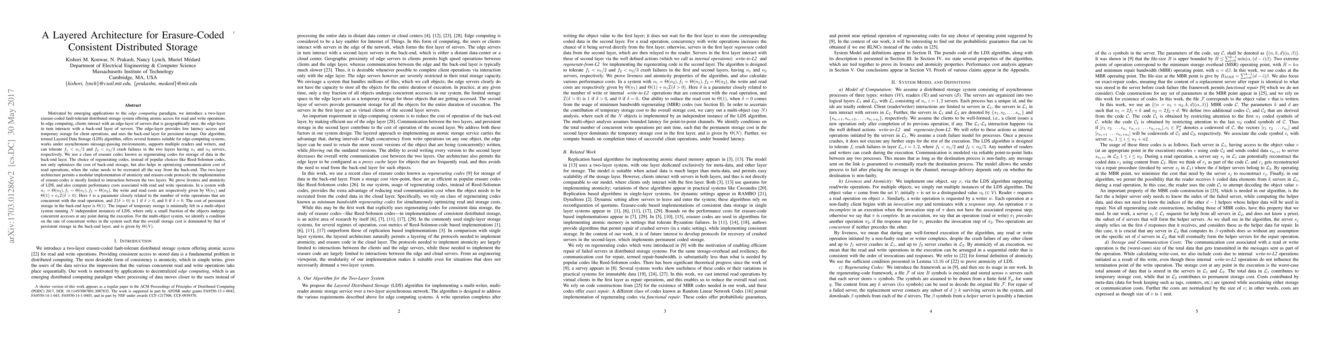 This paper introduces a two-layer erasure-coded fault-tolerant distributed storage system for edge computing, termed Layered Data Storage (LDS), which offers atomic access and supports multiple readers and writers. It uses regenerating codes for back-end storage to optimize both cost and communication efficiency, proving liveness, atomicity, and computing performance costs.