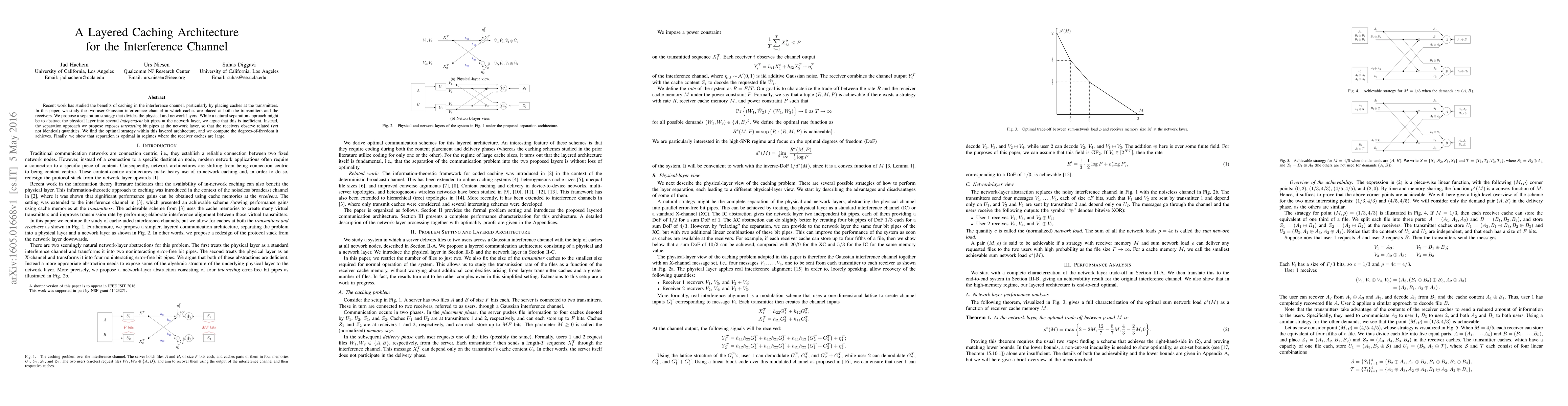 Researchers developed a layered caching architecture for two-user Gaussian interference channels with caches at both transmitters and receivers. They found that separating the physical and network layers achieves optimal performance in regimes where receiver caches are large.