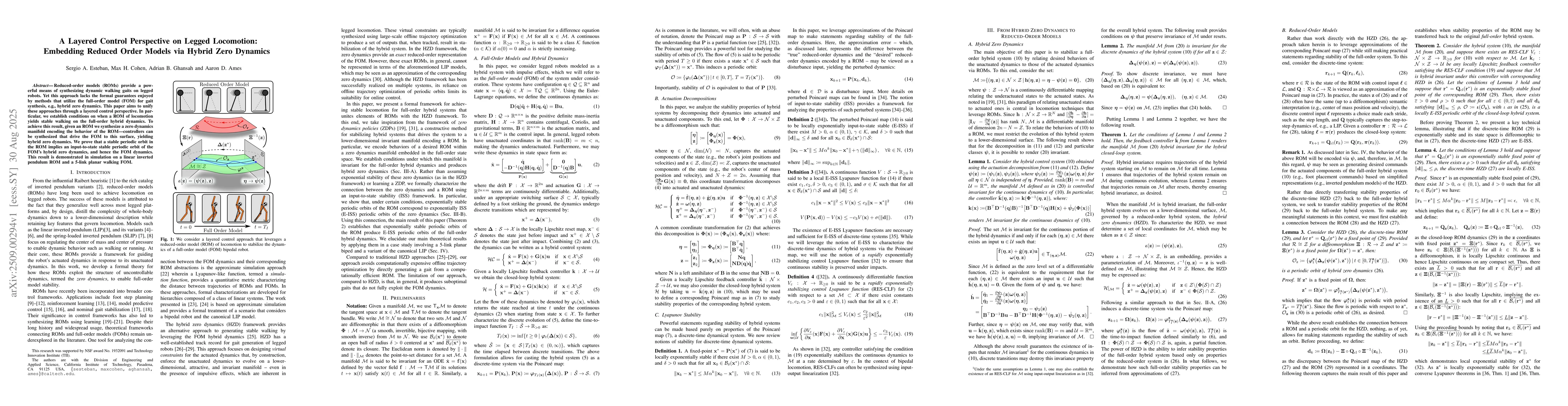 Reduced-order models (ROMs) provide a powerful means of synthesizing dynamic walking gaits on legged robots. Yet this approach lacks the formal guarantees enjoyed by methods that utilize the full-order model (FOM) for gait synthesis, e.g., hybrid zero dynamics. This paper aims to unify these approaches through a layered control perspective. In particular, we establish conditions on when a ROM of locomotion yields stable walking on the full-order hybrid dynamics. To achieve this result, given an ROM we synthesize a zero dynamics manifold encoding the behavior of the ROM -- controllers can be synthesized that drive the FOM to this surface, yielding hybrid zero dynamics. We prove that a stable periodic orbit in the ROM implies an input-to-state stable periodic orbit of the FOM's hybrid zero dynamics, and hence the FOM dynamics. This result is demonstrated in simulation on a linear inverted pendulum ROM and a 5-link planar walking FOM.