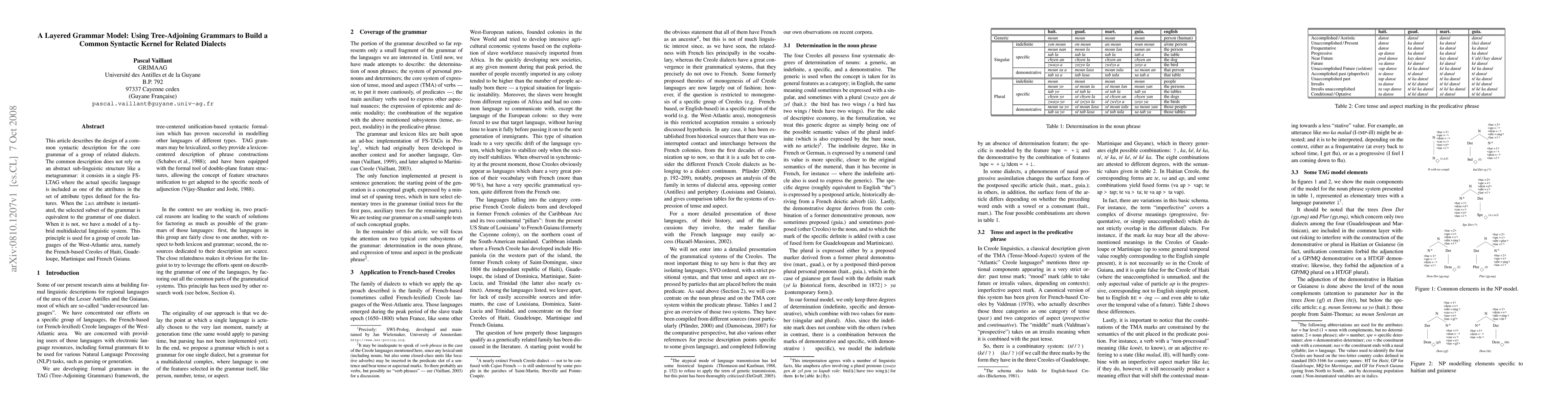 This article describes the design of a common syntactic description for the core grammar of a group of related dialects. The common description does not rely on an abstract sub-linguistic structure like a metagrammar: it consists in a single FS-LTAG where the actual specific language is included as one of the attributes in the set of attribute types defined for the features. When the lang attribute is instantiated, the selected subset of the grammar is equivalent to the grammar of one dialect. When it is not, we have a model of a hybrid multidialectal linguistic system. This principle is used for a group of creole languages of the West-Atlantic area, namely the French-based Creoles of Haiti, Guadeloupe, Martinique and French Guiana.