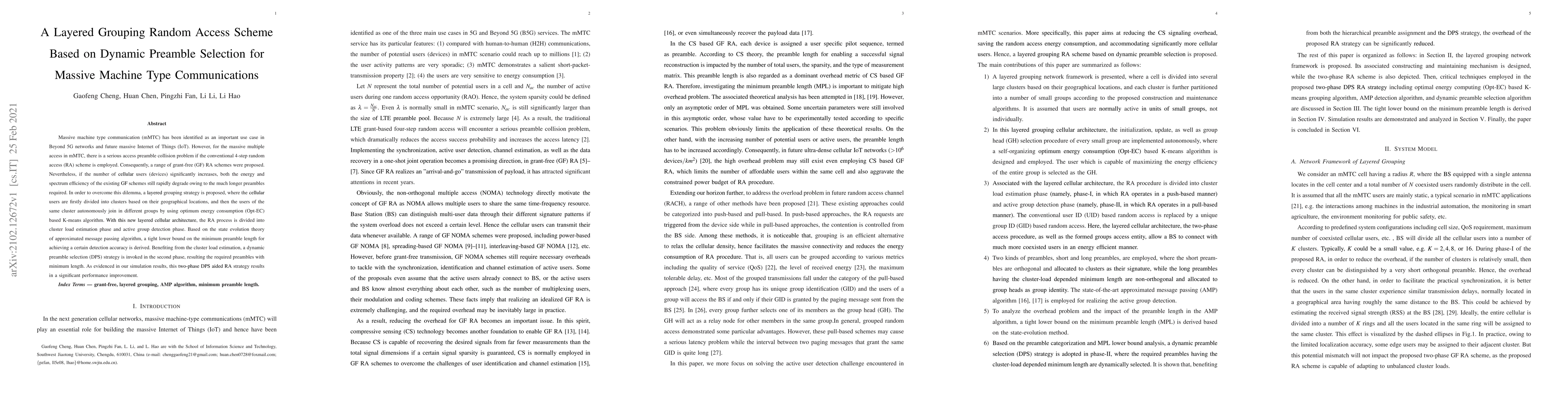 Massive machine type communication (mMTC) has been identified as an important use case in Beyond 5G networks and future massive Internet of Things (IoT). However, for the massive multiple access in mMTC, there is a serious access preamble collision problem if the conventional 4-step random access (RA) scheme is employed. Consequently, a range of grantfree (GF) RA schemes were proposed. Nevertheless, if the number of cellular users (devices) significantly increases, both the energy and spectrum efficiency of the existing GF schemes still rapidly degrade owing to the much longer preambles required. In order to overcome this dilemma, a layered grouping strategy is proposed, where the cellular users are firstly divided into clusters based on their geographical locations, and then the users of the same cluster autonomously join in different groups by using optimum energy consumption (Opt-EC) based K-means algorithm. With this new layered cellular architecture, the RA process is divided into cluster load estimation phase and active group detection phase. Based on the state evolution theory of approximated message passing algorithm, a tight lower bound on the minimum preamble length for achieving a certain detection accuracy is derived. Benefiting from the cluster load estimation, a dynamic preamble selection (DPS) strategy is invoked in the second phase, resulting the required preambles with minimum length. As evidenced in our simulation results, this two-phase DPS aided RA strategy results in a significant performance improvement