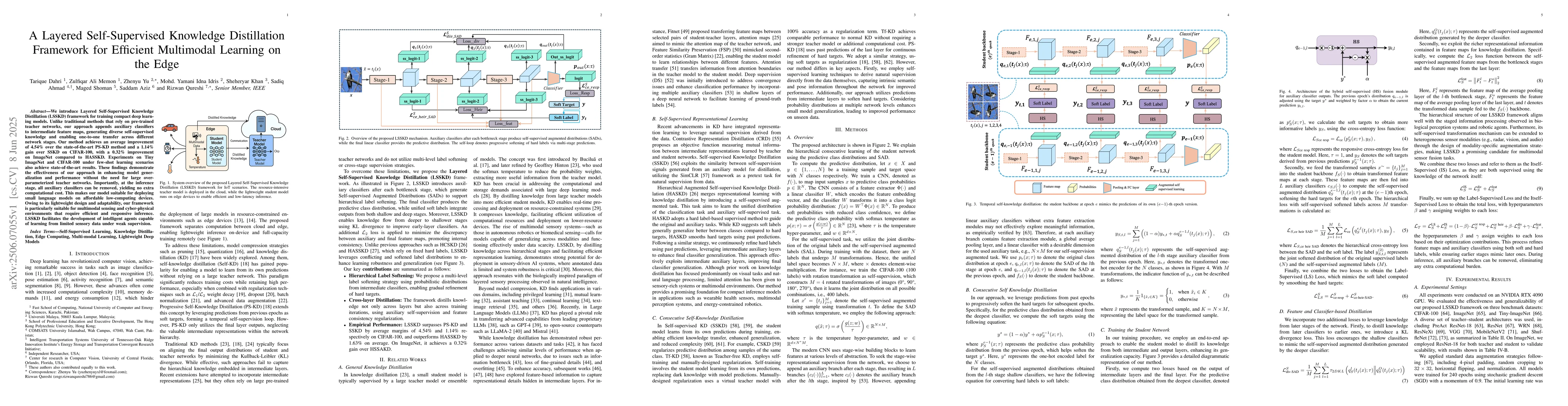 We introduce Layered Self-Supervised Knowledge Distillation (LSSKD) framework for training compact deep learning models. Unlike traditional methods that rely on pre-trained teacher networks, our approach appends auxiliary classifiers to intermediate feature maps, generating diverse self-supervised knowledge and enabling one-to-one transfer across different network stages. Our method achieves an average improvement of 4.54\% over the state-of-the-art PS-KD method and a 1.14% gain over SSKD on CIFAR-100, with a 0.32% improvement on ImageNet compared to HASSKD. Experiments on Tiny ImageNet and CIFAR-100 under few-shot learning scenarios also achieve state-of-the-art results. These findings demonstrate the effectiveness of our approach in enhancing model generalization and performance without the need for large over-parameterized teacher networks. Importantly, at the inference stage, all auxiliary classifiers can be removed, yielding no extra computational cost. This makes our model suitable for deploying small language models on affordable low-computing devices. Owing to its lightweight design and adaptability, our framework is particularly suitable for multimodal sensing and cyber-physical environments that require efficient and responsive inference. LSSKD facilitates the development of intelligent agents capable of learning from limited sensory data under weak supervision.