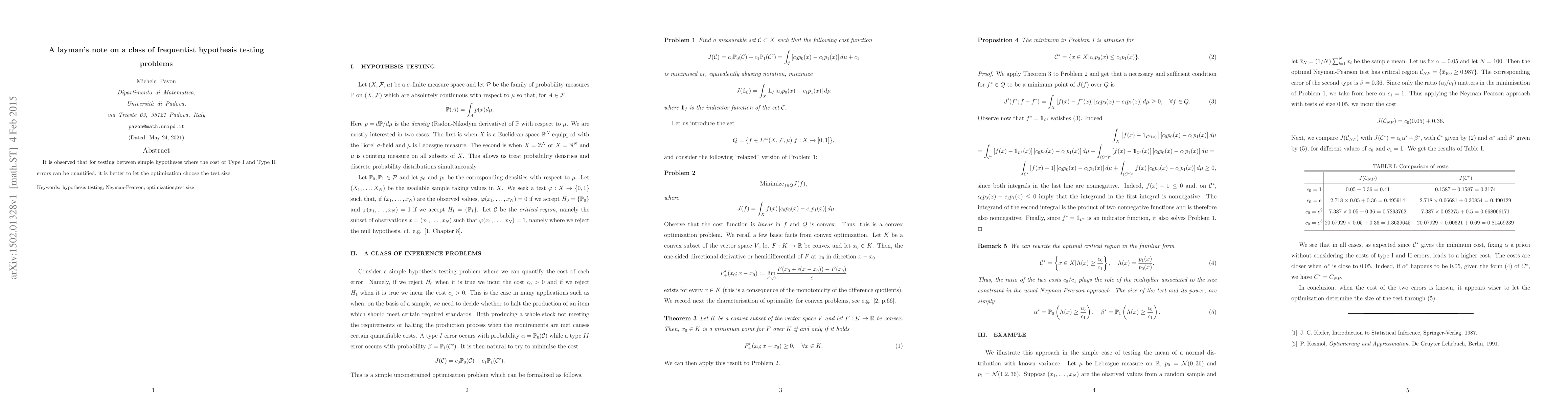 It is observed that for testing between simple hypotheses where the cost of Type I and Type II errors can be quantified, it is better to let the optimization choose the test size.