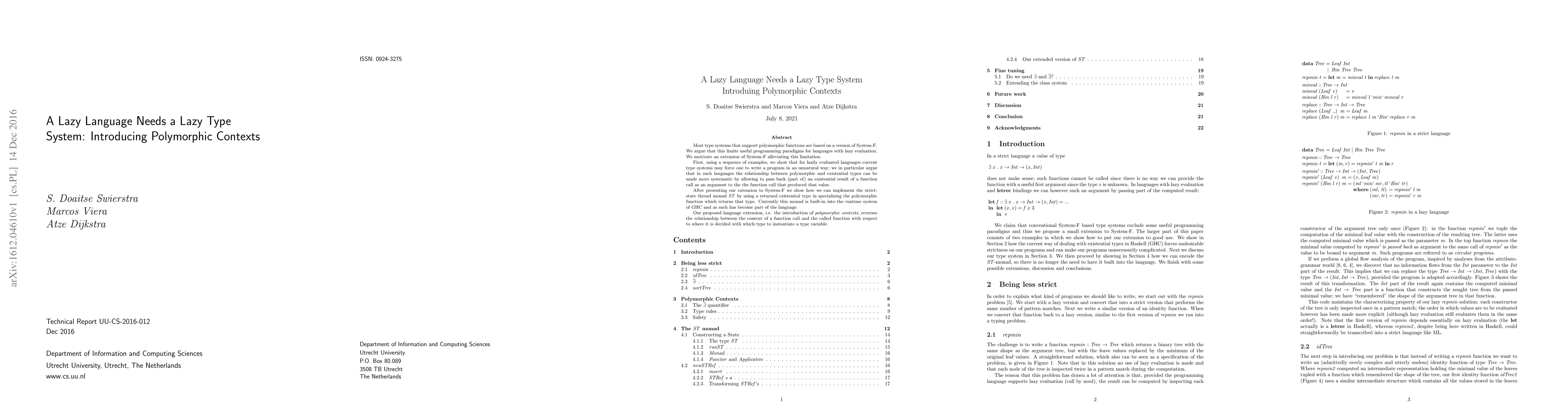 This paper proposes an extension to System-F to better support lazy evaluation in programming languages. It argues that current type systems force unnatural program structures in lazy languages and introduces polymorphic contexts to reverse the instantiation of type variables, improving the programming paradigm.