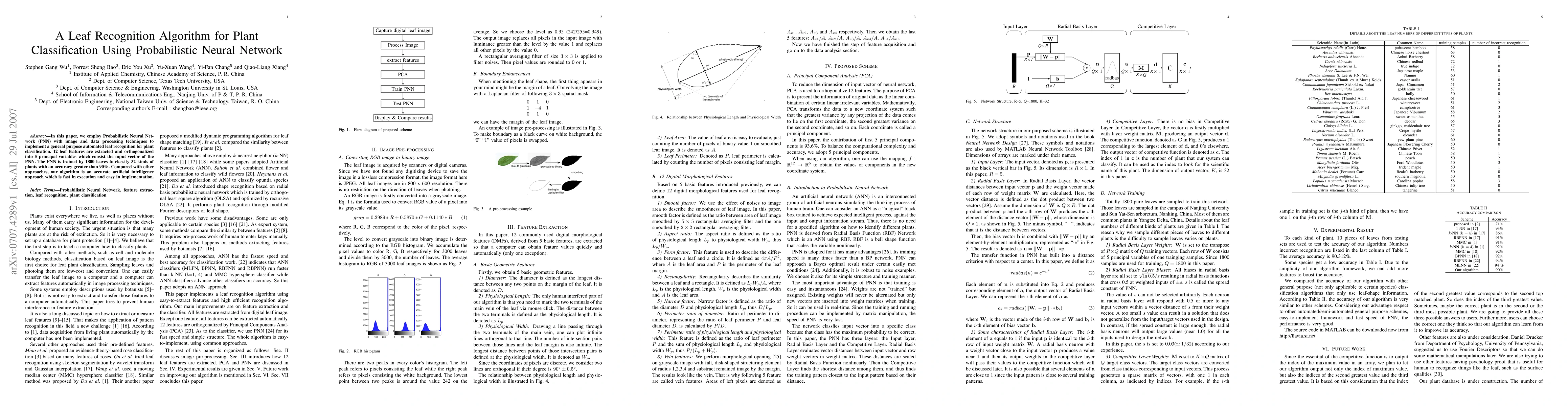 In this paper, we employ Probabilistic Neural Network (PNN) with image and data processing techniques to implement a general purpose automated leaf recognition algorithm. 12 leaf features are extracted and orthogonalized into 5 principal variables which consist the input vector of the PNN. The PNN is trained by 1800 leaves to classify 32 kinds of plants with an accuracy greater than 90%. Compared with other approaches, our algorithm is an accurate artificial intelligence approach which is fast in execution and easy in implementation.