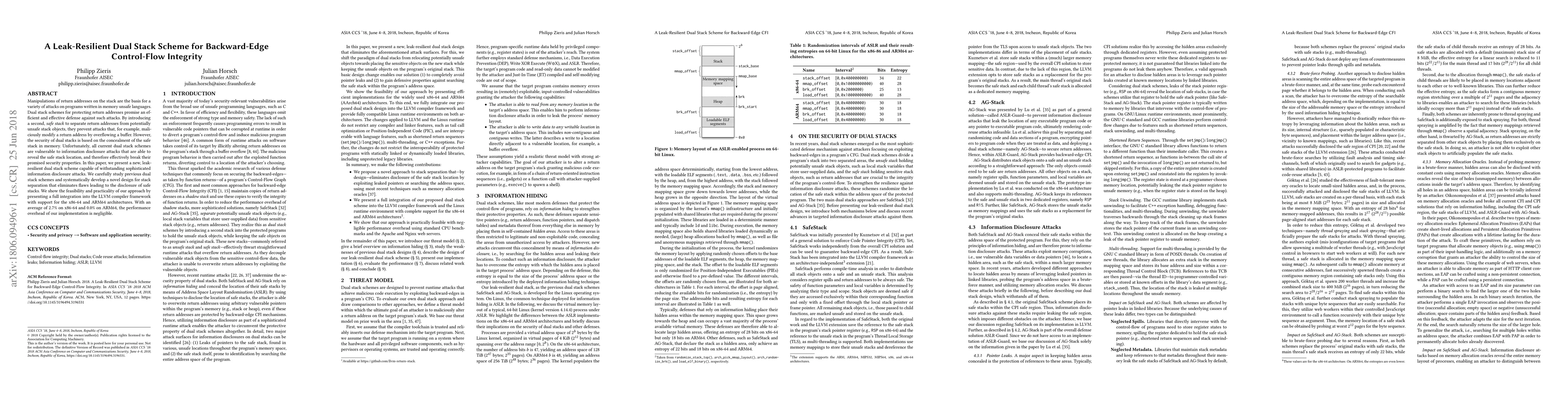Researchers developed a new dual stack scheme to protect return addresses from attacks, achieving negligible performance overhead and outperforming previous designs with improved security against information disclosure attacks.