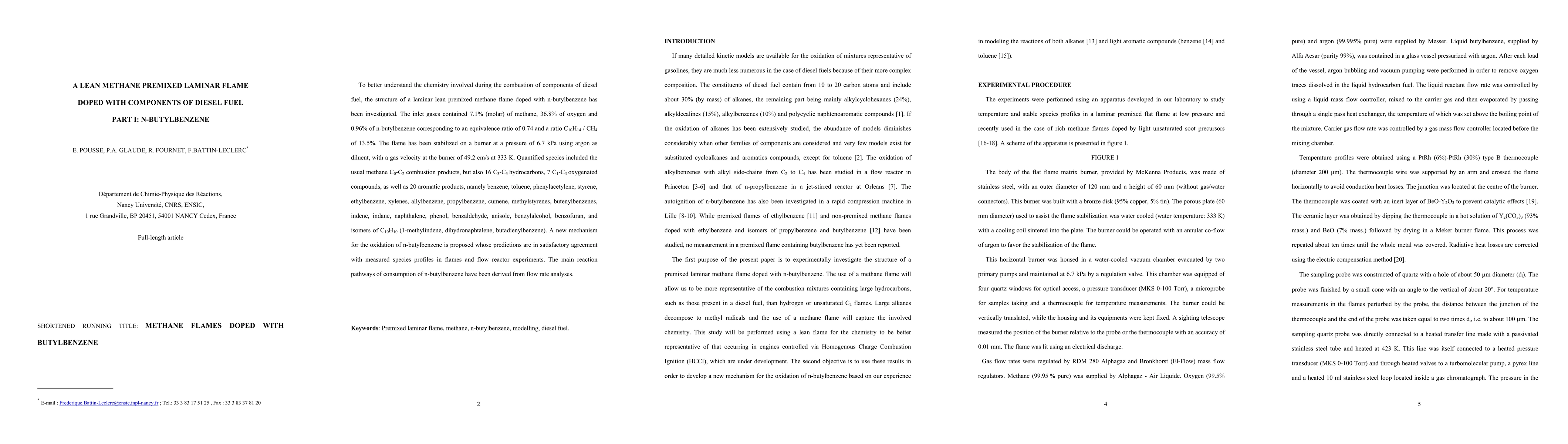 To better understand the chemistry involved during the combustion of components of diesel fuel, the structure of a laminar lean premixed methane flame doped with n-butylbenzene has been investigated. The inlet gases contained 7.1% (molar) of methane, 36.8% of oxygen and 0.96% of n-butylbenzene corresponding to an equivalence ratio of 0.74 and a ratio C10H14 / CH4 of 13.5%. The flame has been stabilized on a burner at a pressure of 6.7 kPa using argon as diluent, with a gas velocity at the burner of 49.2 cm/s at 333 K. Quantified species included the usual methane C0-C2 combustion products, but also 16 C3-C5 hydrocarbons, 7 C1-C3 oxygenated compounds, as well as 20 aromatic products, namely benzene, toluene, phenylacetylene, styrene, ethylbenzene, xylenes, allylbenzene, propylbenzene, cumene, methylstyrenes, butenylbenzenes, indene, indane, naphthalene, phenol, benzaldehyde, anisole, benzylalcohol, benzofuran, and isomers of C10H10 (1-methylindene, dihydronaphtalene, butadienylbenzene). A new mechanism for the oxidation of n-butylbenzene is proposed whose predictions are in satisfactory agreement with measured species profiles in flames and flow reactor experiments. The main reaction pathways of consumption of n butylbenzene have been derived from flow rate analyses.