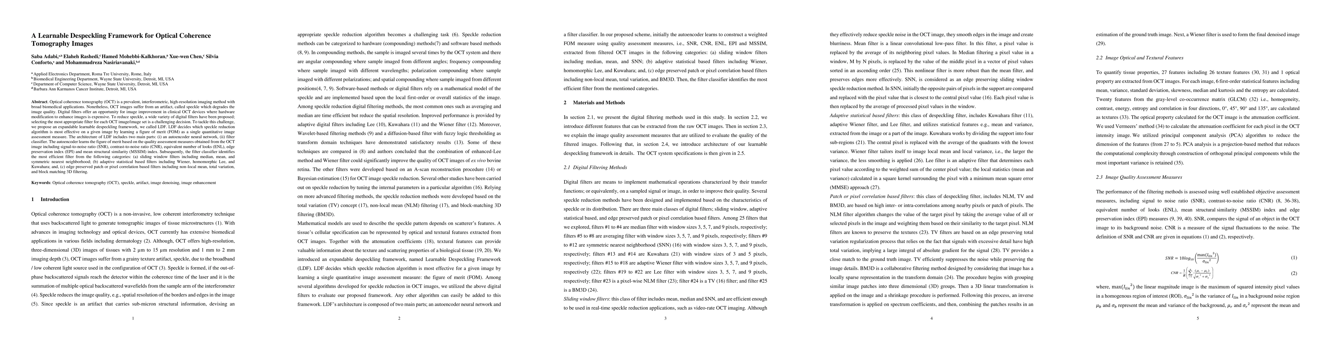 This paper proposes a learnable despeckling framework (LDF) for improving the quality of optical coherence tomography (OCT) images by automatically selecting the best speckle reduction algorithm. The framework uses an autoencoder to learn a figure of merit from quality assessment measures and a filter classifier to choose from various digital filters, enhancing image quality without requiring hardware modifications.