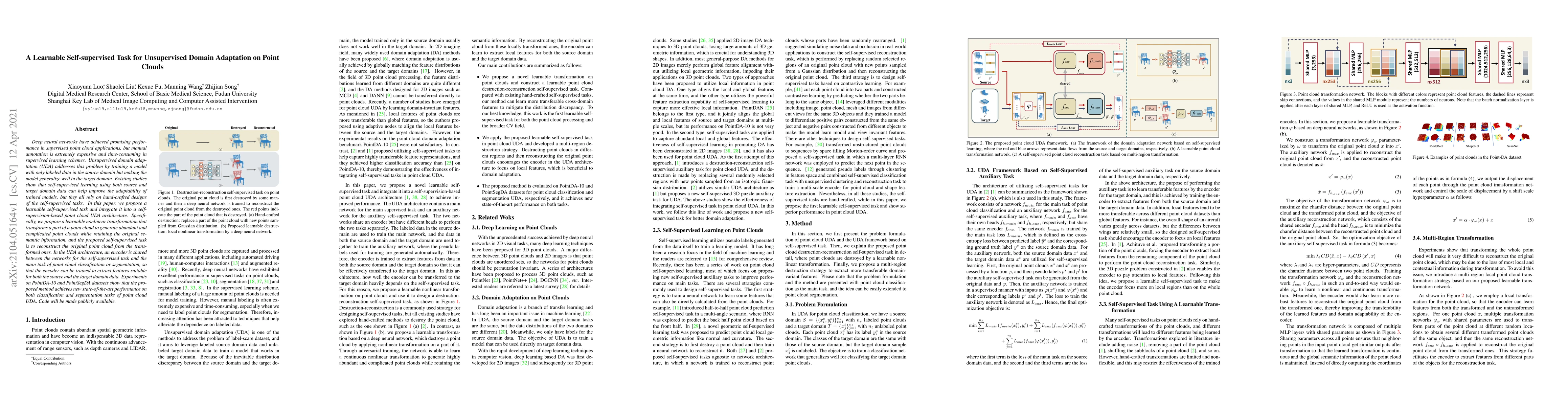 This paper proposes a learnable self-supervised task for unsupervised domain adaptation on point clouds, aiming to improve model adaptability without requiring manual annotations. The method involves a learnable nonlinear transformation to generate transformed point clouds for reconstruction, enhancing the encoder's feature extraction for both source and target domain data, achieving state-of-the-art performance on classification and segmentation tasks.