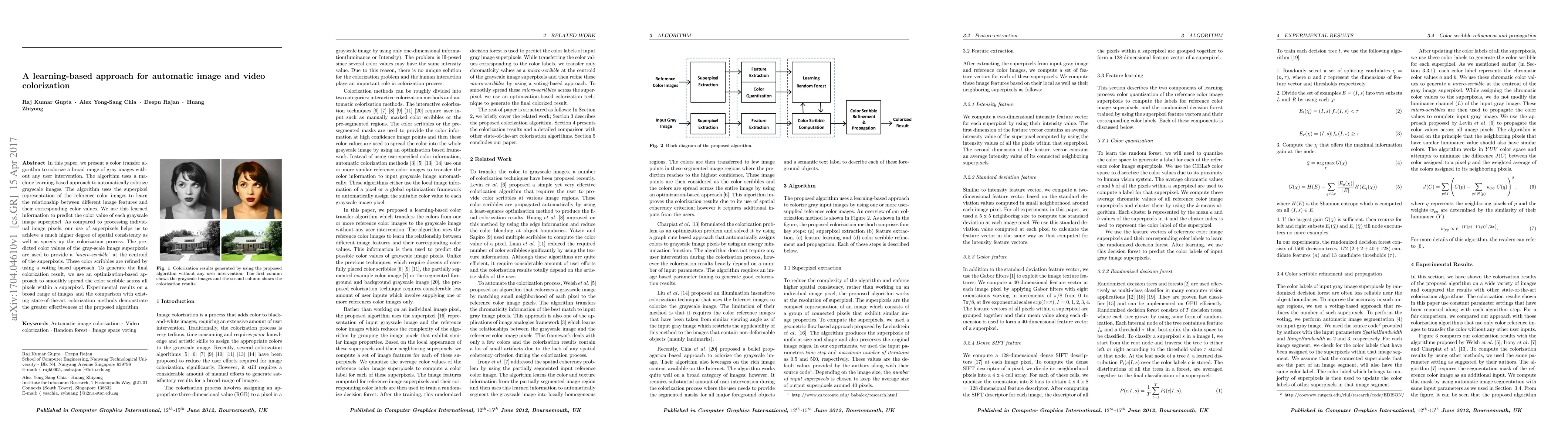 This paper introduces a machine learning-based algorithm for automatic colorization of grayscale images using superpixel representations, achieving higher spatial consistency and faster processing compared to pixel-level methods. The algorithm refines color predictions through a voting-based approach and optimizes color distribution for final results, outperforming existing methods.