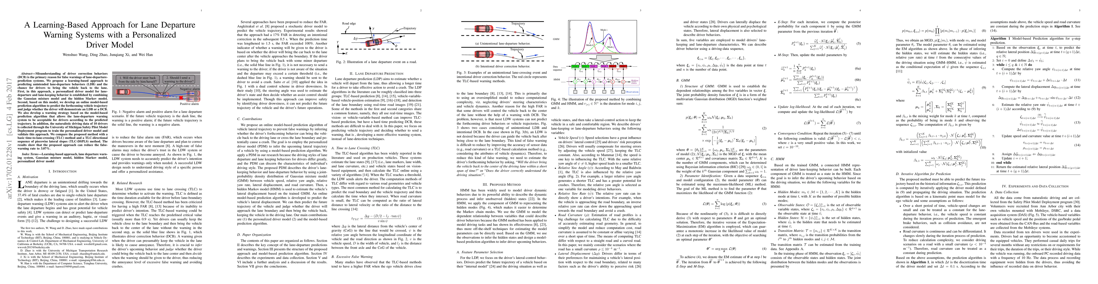 This paper proposes a learning-based approach to improve lane departure warning systems by predicting unintended lane-departure behaviors using a personalized driver model. The model combines Gaussian mixture and hidden Markov models to predict driver behaviors and reduce false warnings, achieving a 3.07% false-warning rate.
