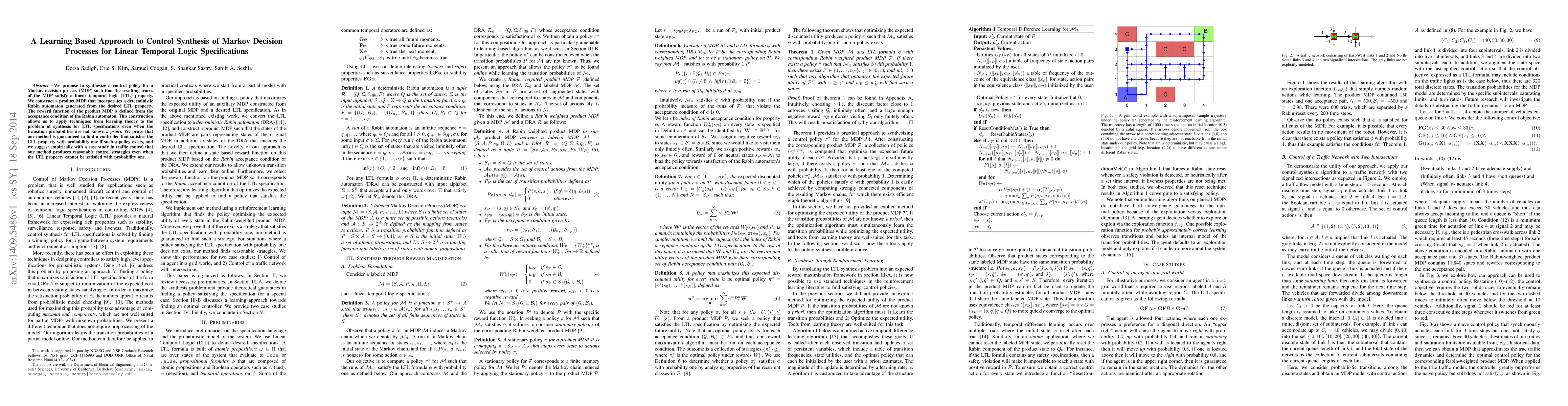 A new method is proposed to synthesize control policies for Markov decision processes that satisfy linear temporal logic properties, even when transition probabilities are unknown. The approach guarantees finding a controller that satisfies the property with probability one in many cases, including a real-world traffic control example.