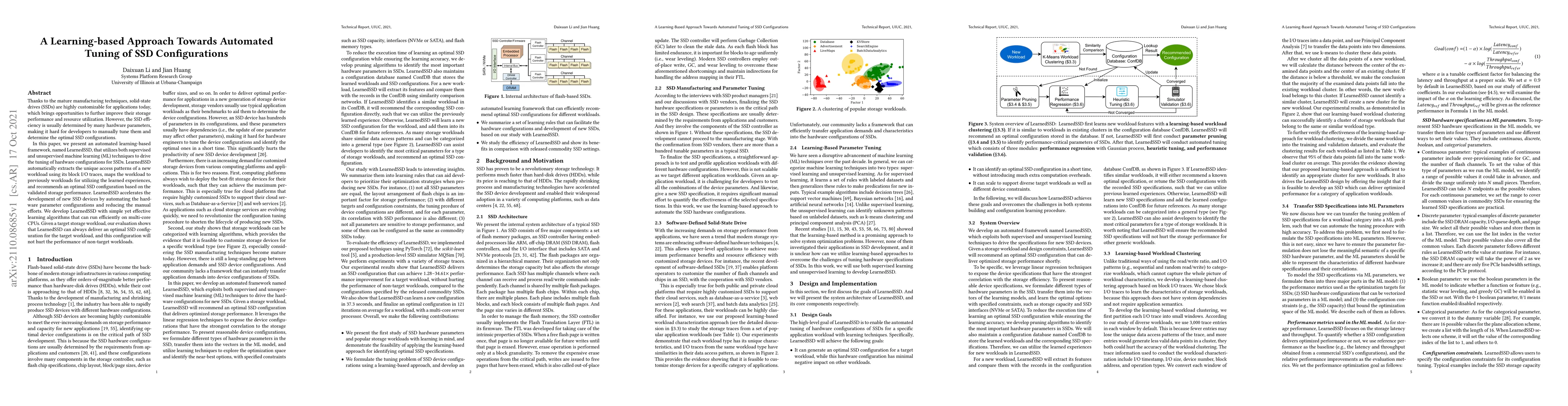 Presented LearnedSSD, a learning-based framework using supervised and unsupervised ML techniques for automated tuning of SSD hardware configurations.