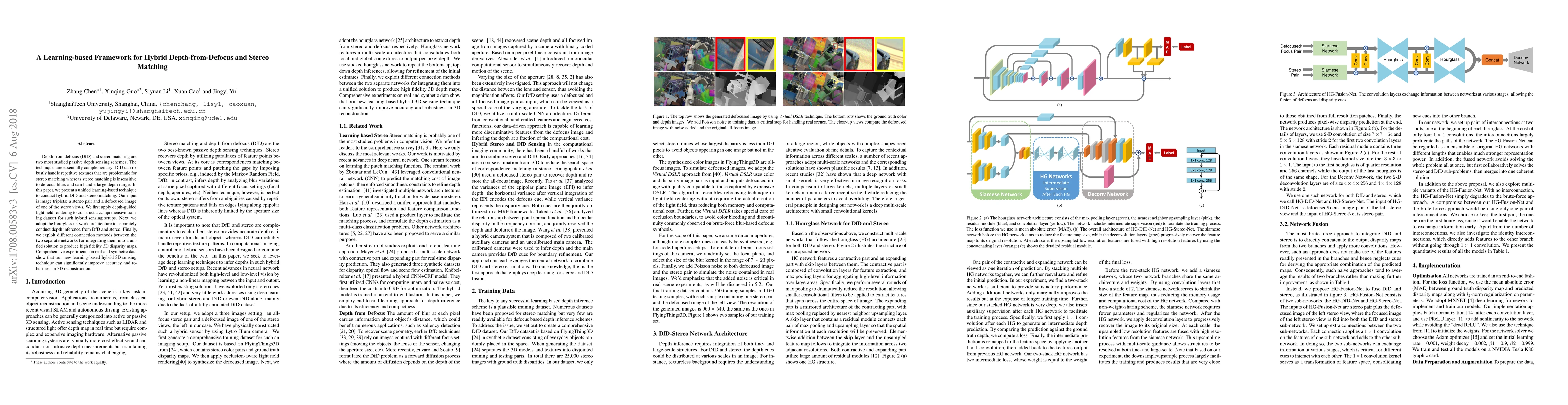 This paper proposes a learning-based framework that integrates depth from defocus (DfD) and stereo matching for enhanced 3D reconstruction. It uses image triplets to train an hourglass network for separate depth inference from both techniques, then combines them for high fidelity 3D disparity maps, demonstrating improved accuracy and robustness.