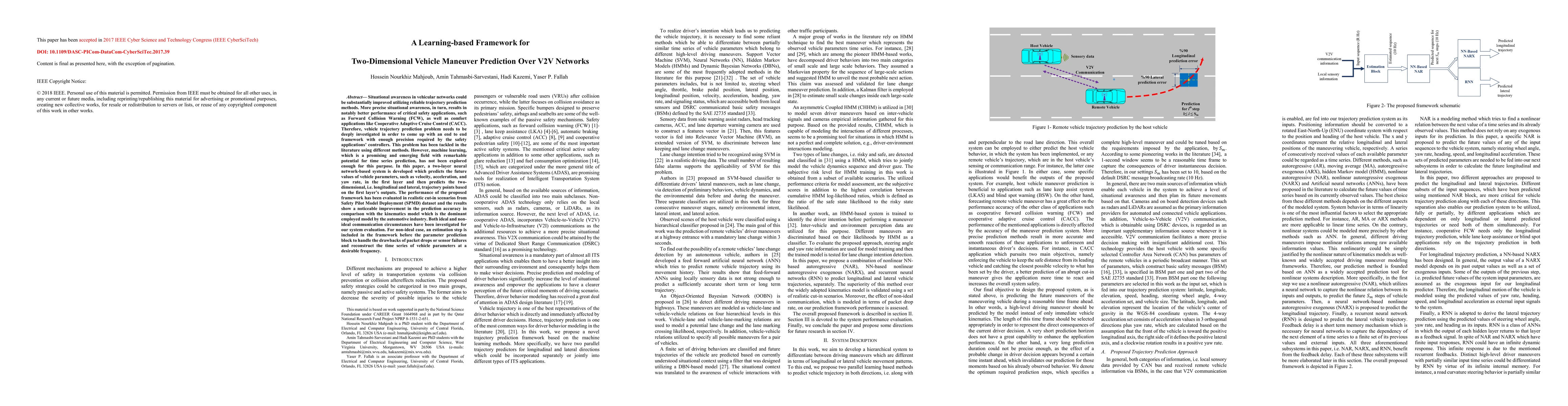 Situational awareness in vehicular networks could be substantially improved utilizing reliable trajectory prediction methods. More precise situational awareness, in turn, results in notably better performance of critical safety applications, such as Forward Collision Warning (FCW), as well as comfort applications like Cooperative Adaptive Cruise Control (CACC). Therefore, vehicle trajectory prediction problem needs to be deeply investigated in order to come up with an end to end framework with enough precision required by the safety applications' controllers. This problem has been tackled in the literature using different methods. However, machine learning, which is a promising and emerging field with remarkable potential for time series prediction, has not been explored enough for this purpose. In this paper, a two-layer neural network-based system is developed which predicts the future values of vehicle parameters, such as velocity, acceleration, and yaw rate, in the first layer and then predicts the two-dimensional, i.e. longitudinal and lateral, trajectory points based on the first layer's outputs. The performance of the proposed framework has been evaluated in realistic cut-in scenarios from Safety Pilot Model Deployment (SPMD) dataset and the results show a noticeable improvement in the prediction accuracy in comparison with the kinematics model which is the dominant employed model by the automotive industry. Both ideal and nonideal communication circumstances have been investigated for our system evaluation. For non-ideal case, an estimation step is included in the framework before the parameter prediction block to handle the drawbacks of packet drops or sensor failures and reconstruct the time series of vehicle parameters at a desirable frequency.