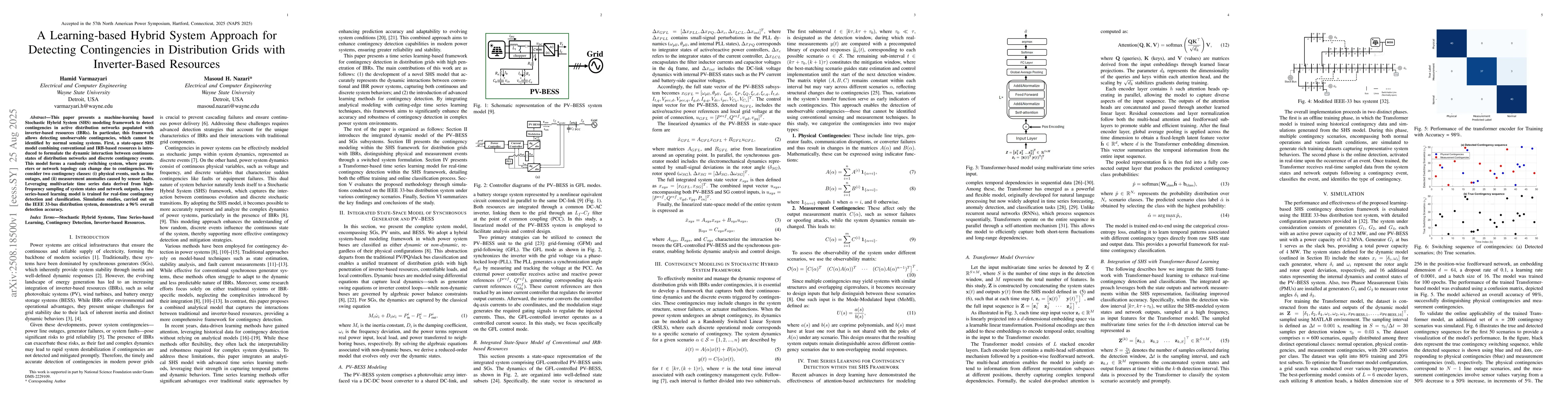 This paper presents a machine-learning based Stochastic Hybrid System (SHS) modeling framework to detect contingencies in active distribution networks populated with inverter-based resources (IBRs). In particular, this framework allows detecting unobservable contingencies, which cannot be identified by normal sensing systems. First, a state-space SHS model combining conventional and IRB-based resources is introduced to formulate the dynamic interaction between continuous states of distribution networks and discrete contingency events. This model forms a randomly switching system, where parameters or network topology can change due to contingencies. We consider two contingency classes: (i) physical events, such as line outages, and (ii) measurement anomalies caused by sensor faults. Leveraging multivariate time series data derived from high-frequency sampling of system states and network outputs, a time series-based learning model is trained for real-time contingency detection and classification. Simulation studies, carried out on the IEEE 33-bus distribution system, demonstrate a 96% overall detection accuracy.