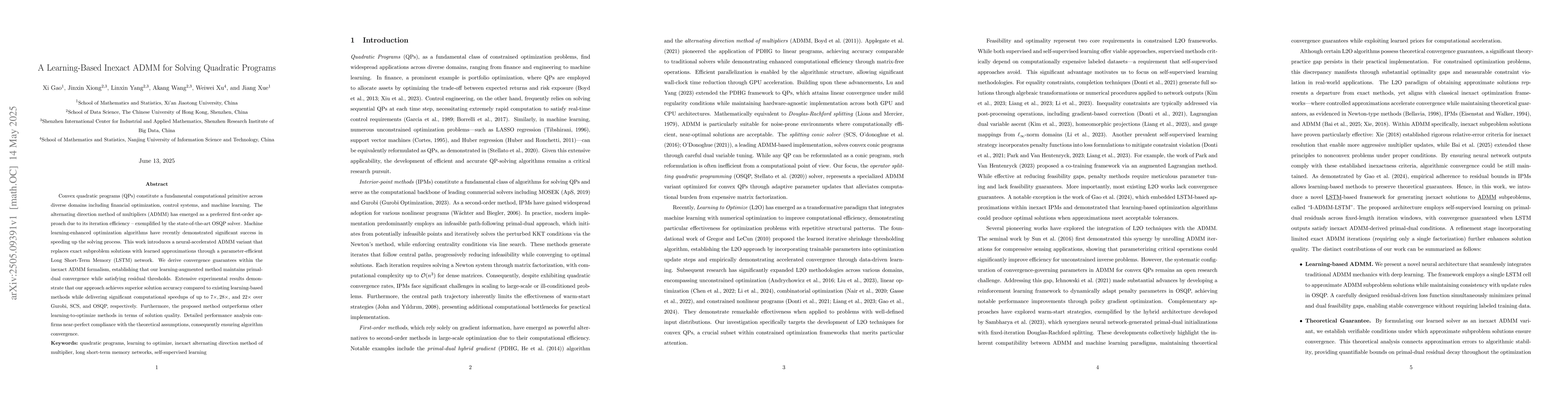 This work stands out by combining inexact ADMM with a parameter-efficient LSTM network for accelerating quadratic program solving, outperforming existing learning-based methods in both accuracy and speed.