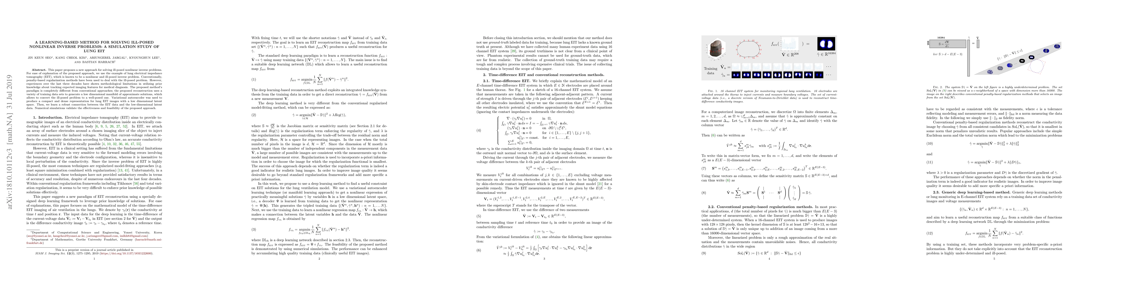 This paper proposes a learning-based method using variational autoencoders to solve ill-posed nonlinear inverse problems, exemplified by lung electrical impedance tomography (EIT). The method transforms the ill-posed problem into a well-posed one by learning a robust connection between EIT data and a low-dimensional latent space representation, validated through numerical simulations.