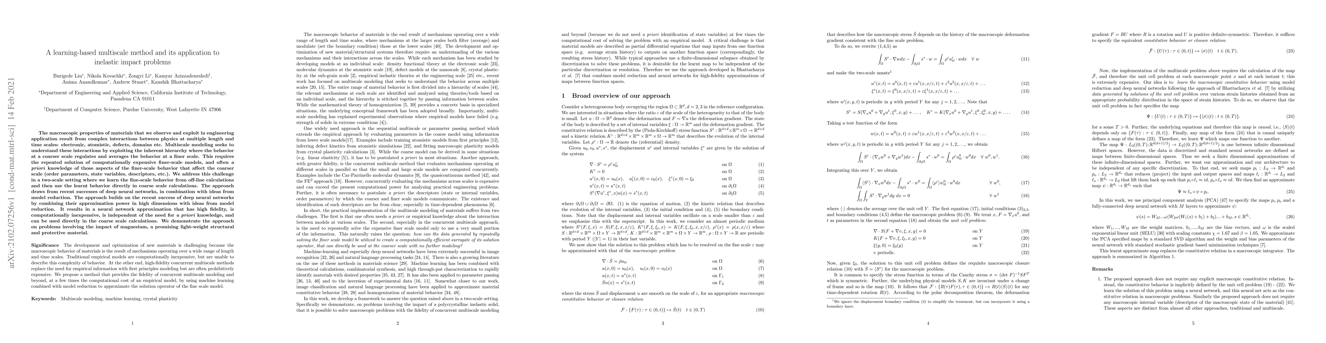 The macroscopic properties of materials that we observe and exploit in engineering application result from complex interactions between physics at multiple length and time scales: electronic, atomistic, defects, domains etc. Multiscale modeling seeks to understand these interactions by exploiting the inherent hierarchy where the behavior at a coarser scale regulates and averages the behavior at a finer scale. This requires the repeated solution of computationally expensive finer-scale models, and often a priori knowledge of those aspects of the finer-scale behavior that affect the coarser scale (order parameters, state variables, descriptors, etc.). We address this challenge in a two-scale setting where we learn the fine-scale behavior from off-line calculations and then use the learnt behavior directly in coarse scale calculations. The approach draws from recent successes of deep neural networks, in combination with ideas from model reduction. The approach builds on the recent success of deep neural networks by combining their approximation power in high dimensions with ideas from model reduction. It results in a neural network approximation that has high fidelity, is computationally inexpensive, is independent of the need for a priori knowledge, and can be used directly in the coarse scale calculations. We demonstrate the approach on problems involving the impact of magnesium, a promising light-weight structural and protective material.