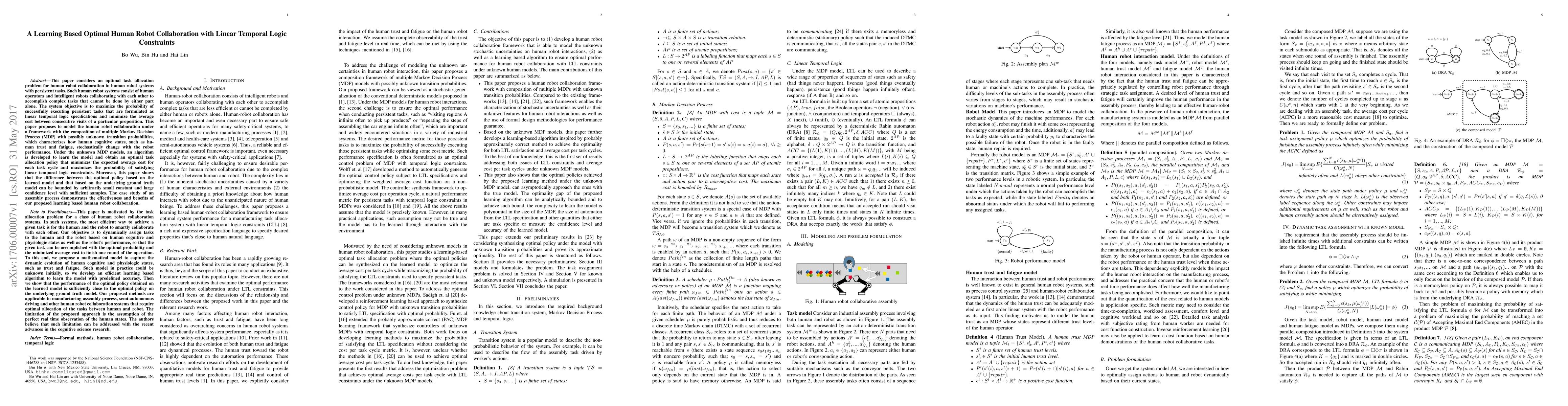 This paper considers an optimal task allocation problem for human robot collaboration in human robot systems with persistent tasks. Such human robot systems consist of human operators and intelligent robots collaborating with each other to accomplish complex tasks that cannot be done by either part alone. The system objective is to maximize the probability of successfully executing persistent tasks that are formulated as linear temporal logic specifications and minimize the average cost between consecutive visits of a particular proposition. This paper proposes to model the human robot collaboration under a framework with the composition of multiple Markov Decision Process (MDP) with possibly unknown transition probabilities, which characterizes how human cognitive states, such as human trust and fatigue, stochastically change with the robot performance. Under the unknown MDP models, an algorithm is developed to learn the model and obtain an optimal task allocation policy that minimizes the expected average cost for each task cycle and maximizes the probability of satisfying linear temporal logic constraints. Moreover, this paper shows that the difference between the optimal policy based on the learned model and that based on the underlying ground truth model can be bounded by arbitrarily small constant and large confidence level with sufficient samples. The case study of an assembly process demonstrates the effectiveness and benefits of our proposed learning based human robot collaboration.