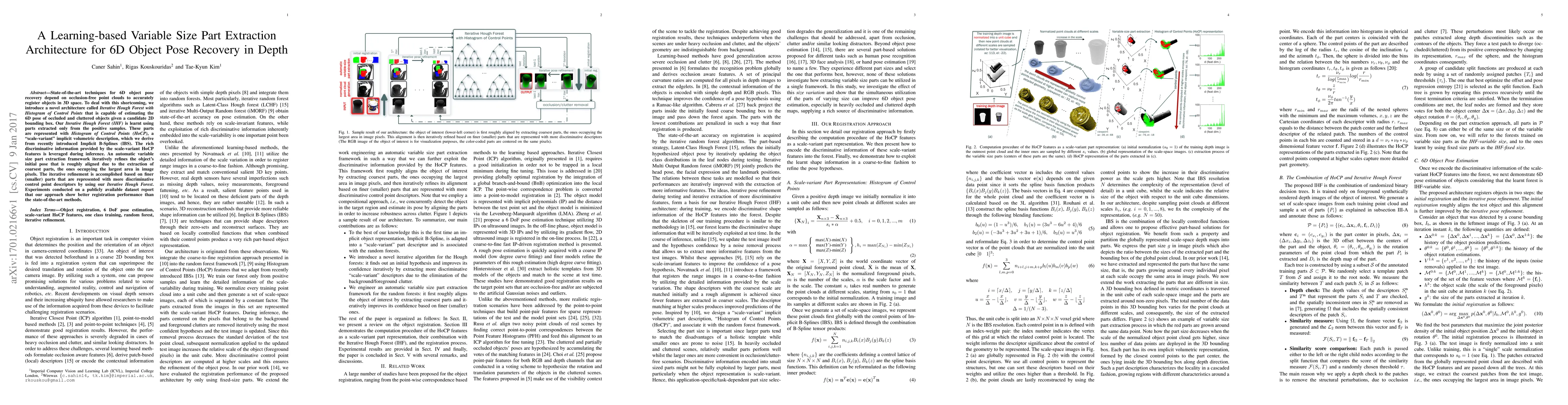 This paper presents a novel architecture called Iterative Hough Forest with Histogram of Control Points for 6D object pose recovery in depth images, capable of handling occlusions and clutter. The method iteratively refines object pose using scale-variant HoCP features derived from Implicit B-Splines, achieving better registration performance than state-of-the-art techniques.