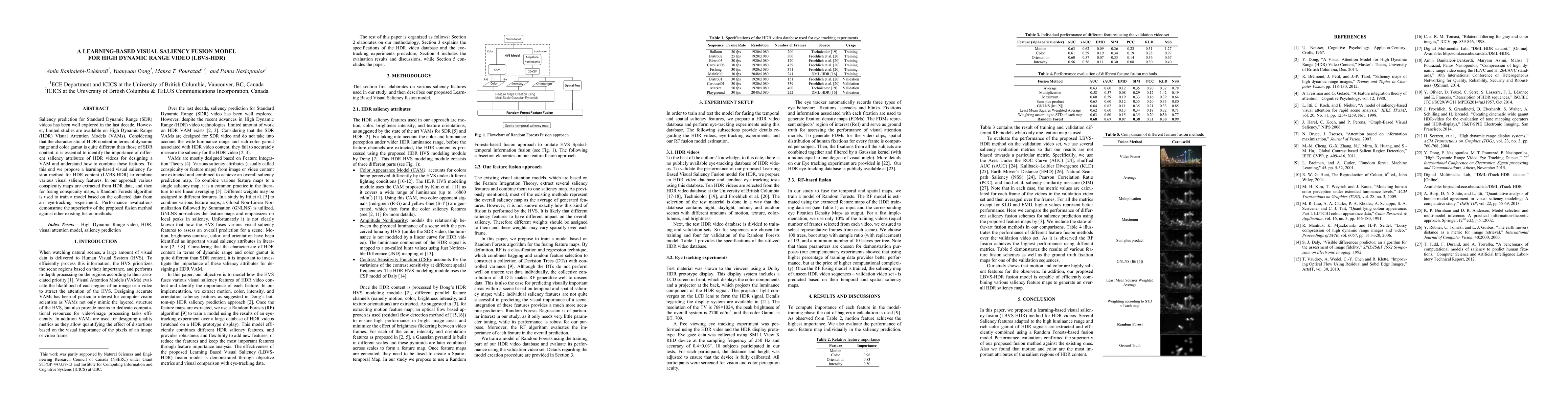 Saliency prediction for Standard Dynamic Range (SDR) videos has been well explored in the last decade. However, limited studies are available on High Dynamic Range (HDR) Visual Attention Models (VAMs). Considering that the characteristic of HDR content in terms of dynamic range and color gamut is quite different than those of SDR content, it is essential to identify the importance of different saliency attributes of HDR videos for designing a VAM and understand how to combine these features. To this end we propose a learning-based visual saliency fusion method for HDR content (LVBS-HDR) to combine various visual saliency features. In our approach various conspicuity maps are extracted from HDR data, and then for fusing conspicuity maps, a Random Forests algorithm is used to train a model based on the collected data from an eye-tracking experiment. Performance evaluations demonstrate the superiority of the proposed fusion method against other existing fusion methods.