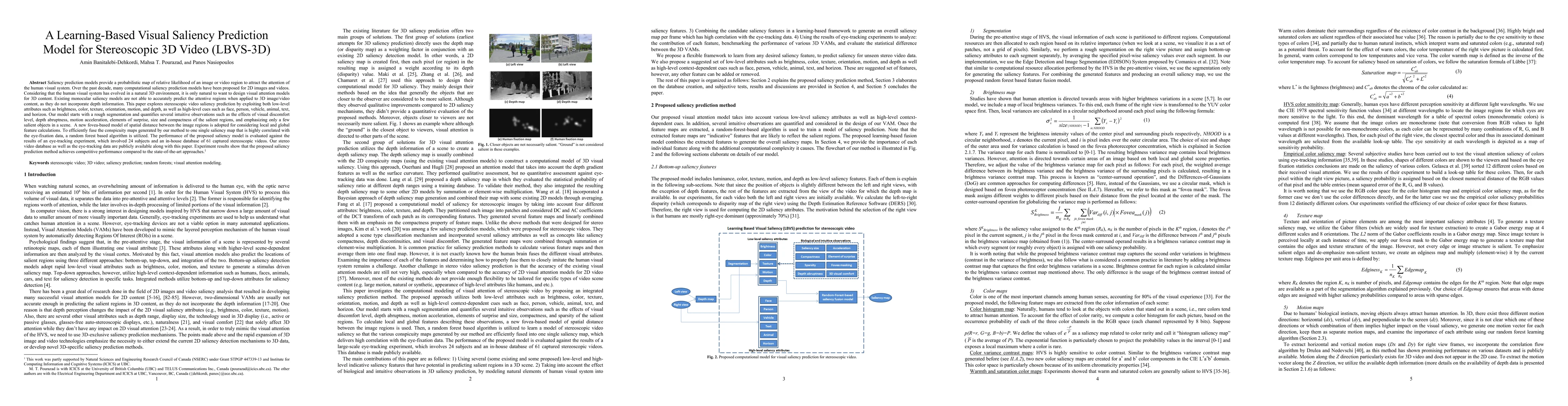 This paper proposes a learning-based visual saliency prediction model for stereoscopic 3D videos, integrating depth and high-level cues to predict attentive regions more accurately than existing monocular models. The model employs a random forest algorithm to fuse conspicuity maps and is validated against an eye-tracking experiment with 24 subjects, demonstrating competitive performance.