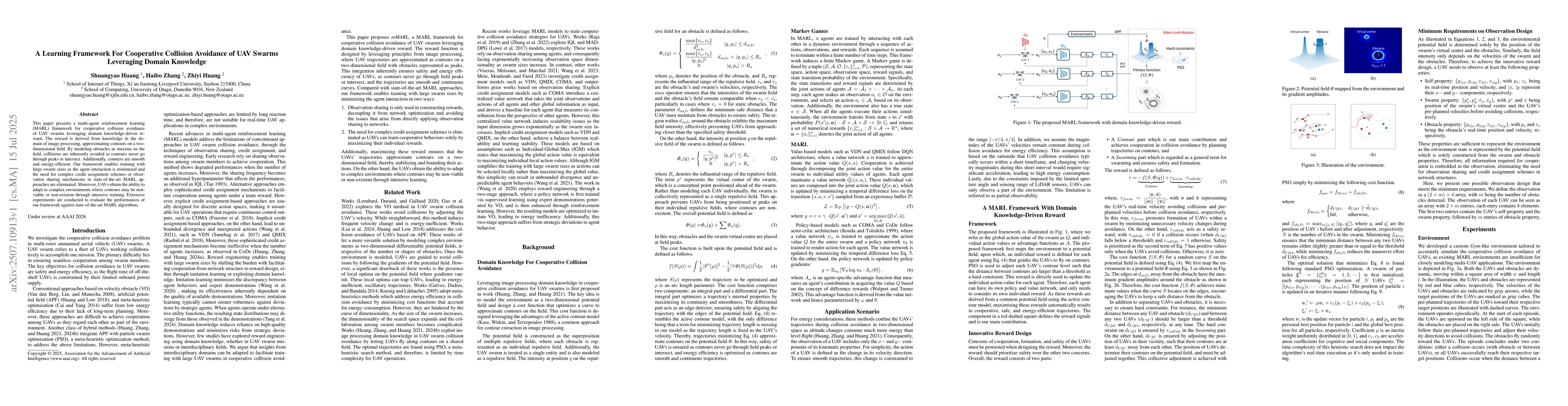 This paper presents a multi-agent reinforcement learning (MARL) framework for cooperative collision avoidance of UAV swarms leveraging domain knowledge-driven reward. The reward is derived from knowledge in the domain of image processing, approximating contours on a two-dimensional field. By modeling obstacles as maxima on the field, collisions are inherently avoided as contours never go through peaks or intersect. Additionally, counters are smooth and energy-efficient. Our framework enables training with large swarm sizes as the agent interaction is minimized and the need for complex credit assignment schemes or observation sharing mechanisms in state-of-the-art MARL approaches are eliminated. Moreover, UAVs obtain the ability to adapt to complex environments where contours may be non-viable or non-existent through intensive training. Extensive experiments are conducted to evaluate the performances of our framework against state-of-the-art MARL algorithms.