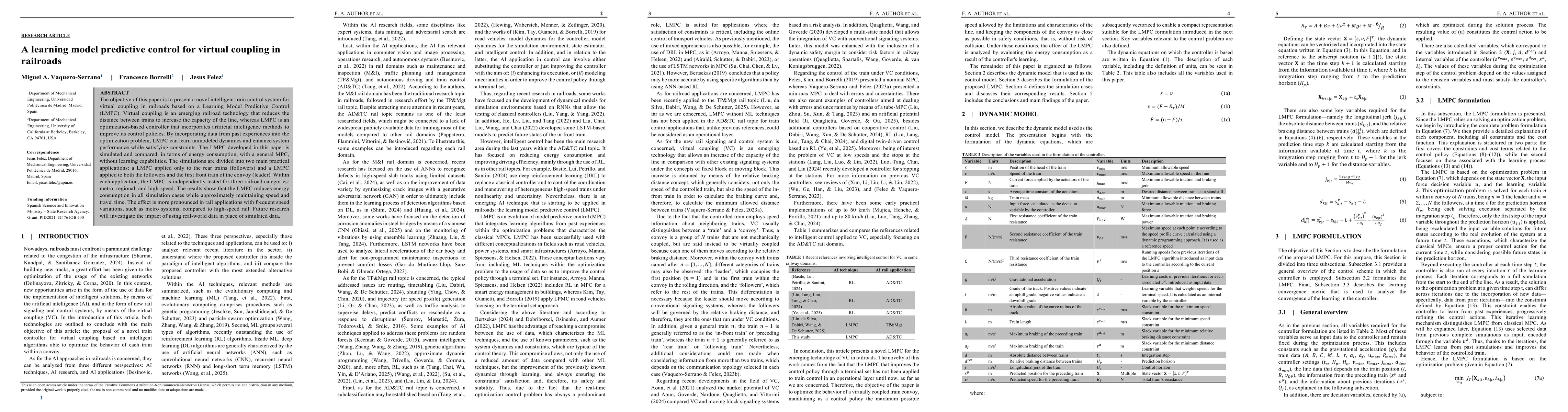 The objective of this paper is to present a novel intelligent train control system for virtual coupling in railroads based on a Learning Model Predictive Control (LMPC). Virtual coupling is an emerging railroad technology that reduces the distance between trains to increase the capacity of the line, whereas LMPC is an optimization-based controller that incorporates artificial intelligence methods to improve its control policies. By incorporating data from past experiences into the optimization problem, LMPC can learn unmodeled dynamics and enhance system performance while satisfying constraints. The LMPC developed in this paper is simulated and compared, in terms of energy consumption, with a general MPC, without learning capabilities. The simulations are divided into two main practical applications: a LMPC applied only to the rear trains (followers) and a LMPC applied to both the followers and the first front train of the convoy (leader). Within each application, the LMPC is independently tested for three railroad categories: metro, regional, and high-speed. The results show that the LMPC reduces energy consumption in all simulation cases while approximately maintaining speed and travel time. The effect is more pronounced in rail applications with frequent speed variations, such as metro systems, compared to high-speed rail. Future research will investigate the impact of using real-world data in place of simulated data.