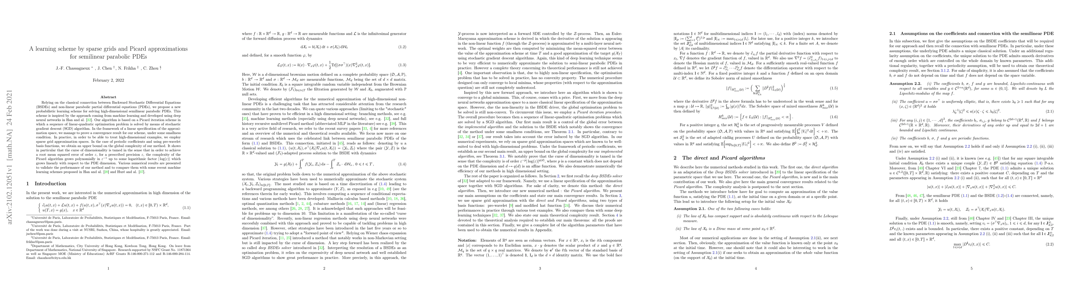 Relying on the classical connection between Backward Stochastic Differential Equations (BSDEs) and non-linear parabolic partial differential equations (PDEs), we propose a new probabilistic learning scheme for solving high-dimensional semi-linear parabolic PDEs. This scheme is inspired by the approach coming from machine learning and developed using deep neural networks in Han and al. [32]. Our algorithm is based on a Picard iteration scheme in which a sequence of linear-quadratic optimisation problem is solved by means of stochastic gradient descent (SGD) algorithm. In the framework of a linear specification of the approximation space, we manage to prove a convergence result for our scheme, under some smallness condition. In practice, in order to be able to treat high-dimensional examples, we employ sparse grid approximation spaces. In the case of periodic coefficients and using pre-wavelet basis functions, we obtain an upper bound on the global complexity of our method. It shows in particular that the curse of dimensionality is tamed in the sense that in order to achieve a root mean squared error of order ${\epsilon}$, for a prescribed precision ${\epsilon}$, the complexity of the Picard algorithm grows polynomially in ${\epsilon}^{-1}$ up to some logarithmic factor $ |log({\epsilon})| $ which grows linearly with respect to the PDE dimension. Various numerical results are presented to validate the performance of our method and to compare them with some recent machine learning schemes proposed in Han and al. [20] and Hur\'e and al. [37].