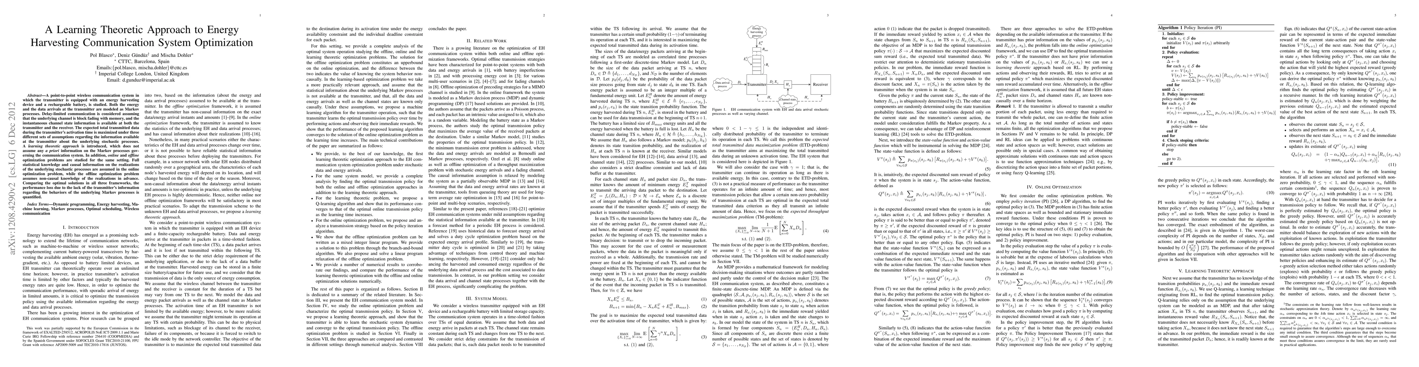 This paper studies a wireless communication system with an energy harvesting transmitter and optimizes data transmission under different information assumptions. It introduces a learning theoretic approach to maximize transmitted data without prior knowledge of stochastic processes, comparing it with online and offline optimization methods that assume full or non-causal knowledge.