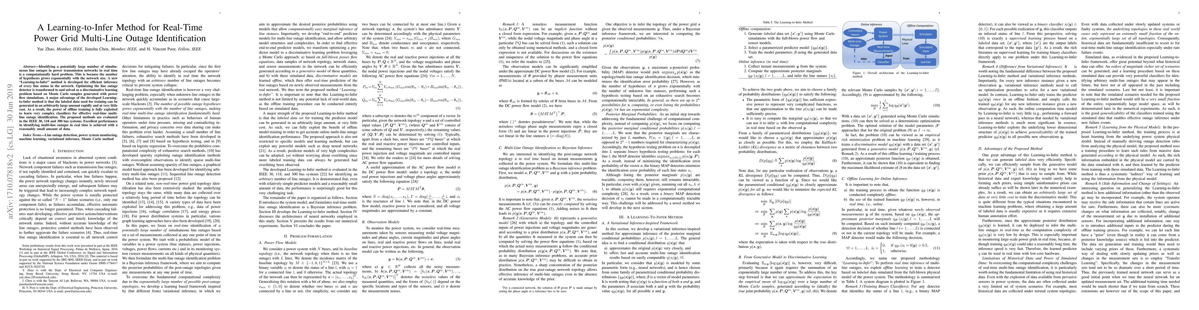 This paper introduces a "Learning-to-Infer" method for real-time identification of multiple simultaneous line outages in power grids, leveraging discriminative learning and Monte Carlo simulations. The method efficiently trains complex classifiers using abundant, low-cost labeled data, achieving excellent performance in outage detection across various IEEE test systems.