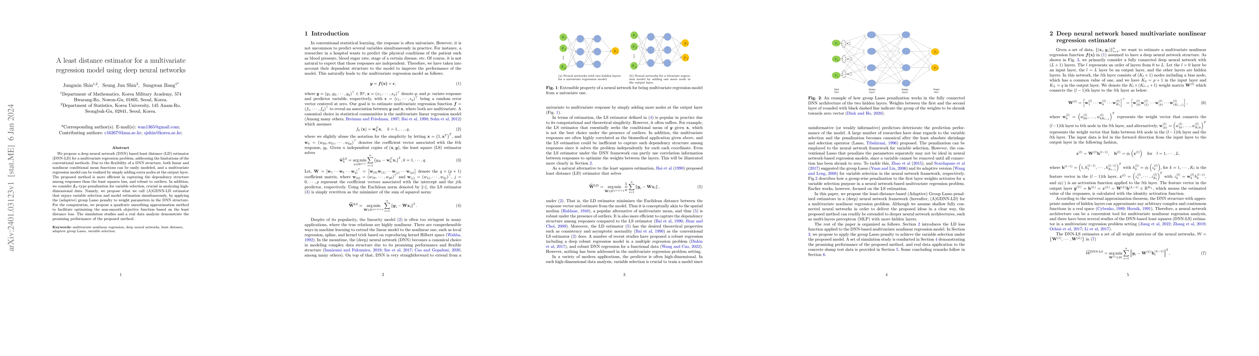 This paper proposes a deep neural network-based least distance estimator (DNN-LD) for multivariate regression, which efficiently models both linear and nonlinear relationships and is robust to outliers. The method incorporates $L_1$-type penalization for variable selection and uses a quadratic smoothing approximation for optimization, demonstrating promising performance in simulations and real data analysis.