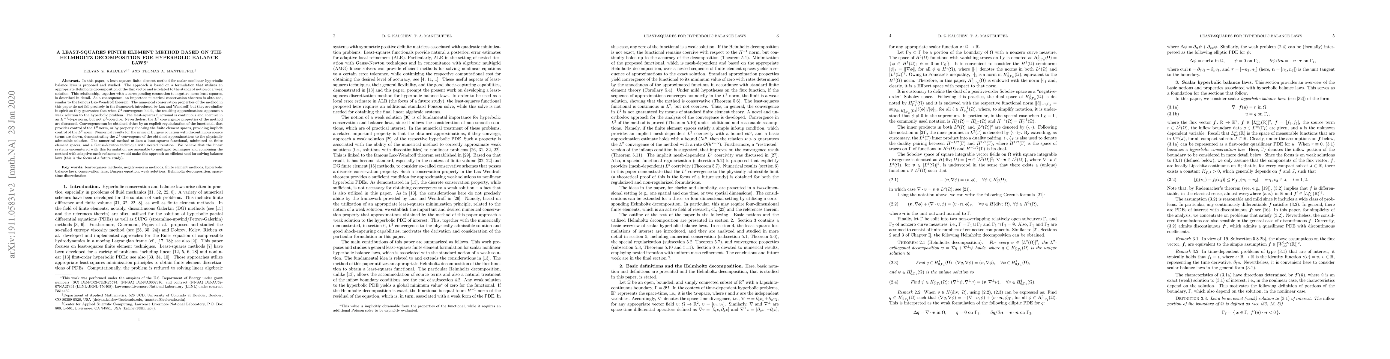This paper proposes a least-squares finite element method for hyperbolic balance laws, utilizing Helmholtz decomposition and negative-norm least-squares. The method guarantees $L^2$ convergence to weak solutions, similar to the Lax-Wendroff theorem, and demonstrates $L^2$ convergence for the inviscid Burgers equation.