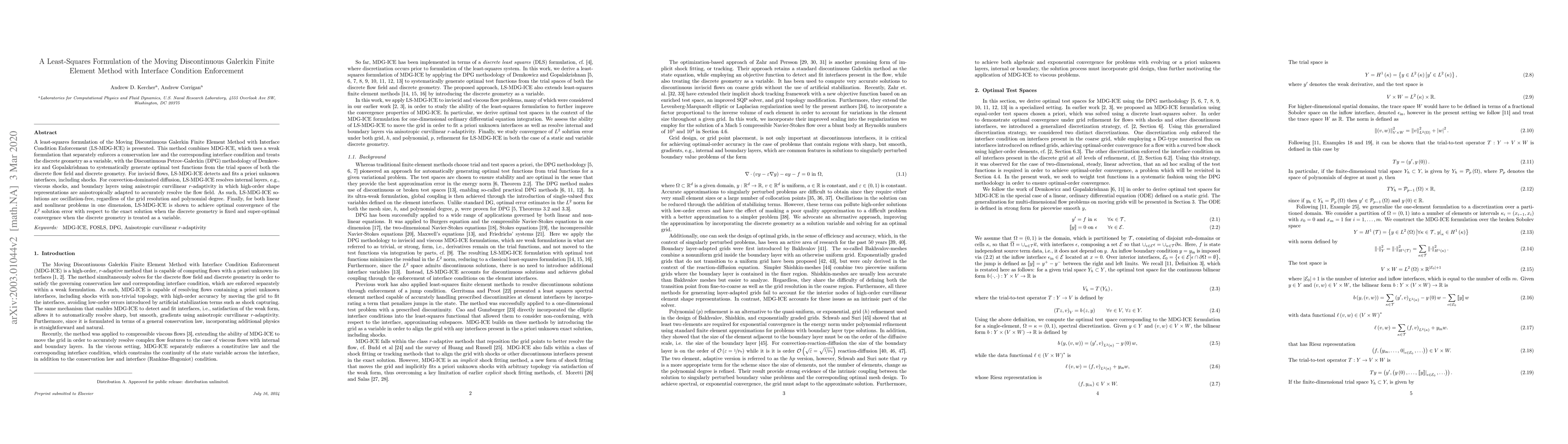 A least-squares formulation of the Moving Discontinuous Galerkin Finite Element Method with Interface Condition Enforcement (LS-MDG-ICE) is presented. This method combines MDG-ICE, which uses a weak formulation that separately enforces a conservation law and the corresponding interface condition and treats the discrete geometry as a variable, with the Discontinuous Petrov-Galerkin (DPG) methodology of Demkowicz and Gopalakrishnan to systematically generate optimal test functions from the trial spaces of both the discrete flow field and discrete geometry. For inviscid flows, LS-MDG-ICE detects and fits a priori unknown interfaces, including shocks. For convection-dominated diffusion, LS-MDG-ICE resolves internal layers, e.g., viscous shocks, and boundary layers using anisotropic curvilinear $r$-adaptivity in which high-order shape representations are anisotropically adapted to accurately resolve the flow field. As such, LS-MDG-ICE solutions are oscillation-free, regardless of the grid resolution and polynomial degree. Finally, for both linear and nonlinear problems in one dimension, LS-MDG-ICE is shown to achieve optimal convergence of the $L^2$ solution error with respect to the exact solution when the discrete geometry is fixed and super-optimal convergence when the discrete geometry is treated as a variable.