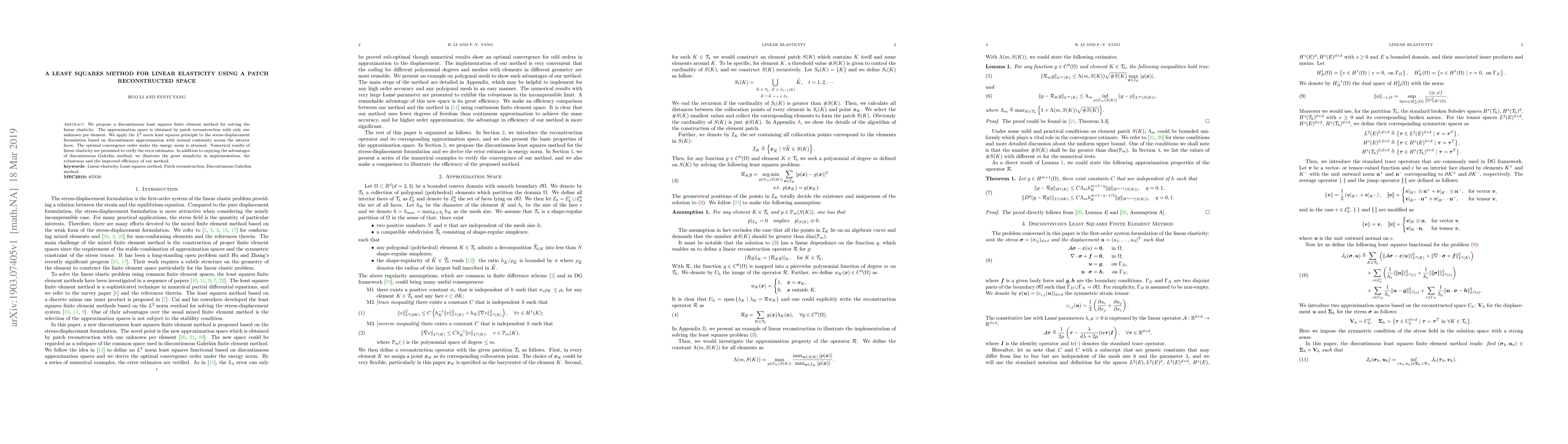This paper presents a novel discontinuous least squares finite element method for solving linear elasticity problems using a patch reconstructed space with one unknown per element. The method achieves optimal convergence and demonstrates simplicity, robustness, and efficiency compared to traditional methods.