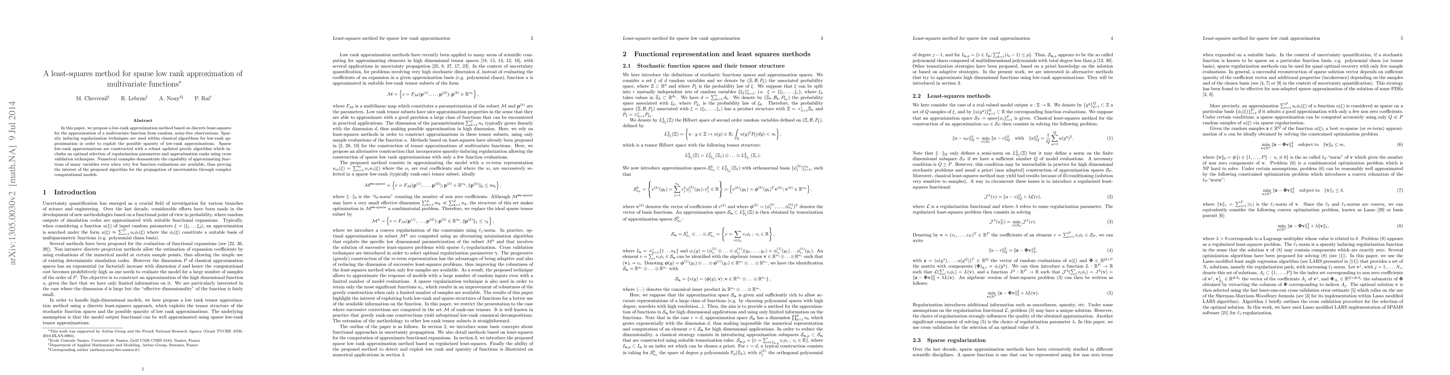 This paper introduces a least-squares method for sparse low-rank approximation of multivariate functions, utilizing regularization techniques and an updated greedy algorithm to exploit sparsity. Numerical examples show the method's effectiveness in approximating complex functions with limited observations.