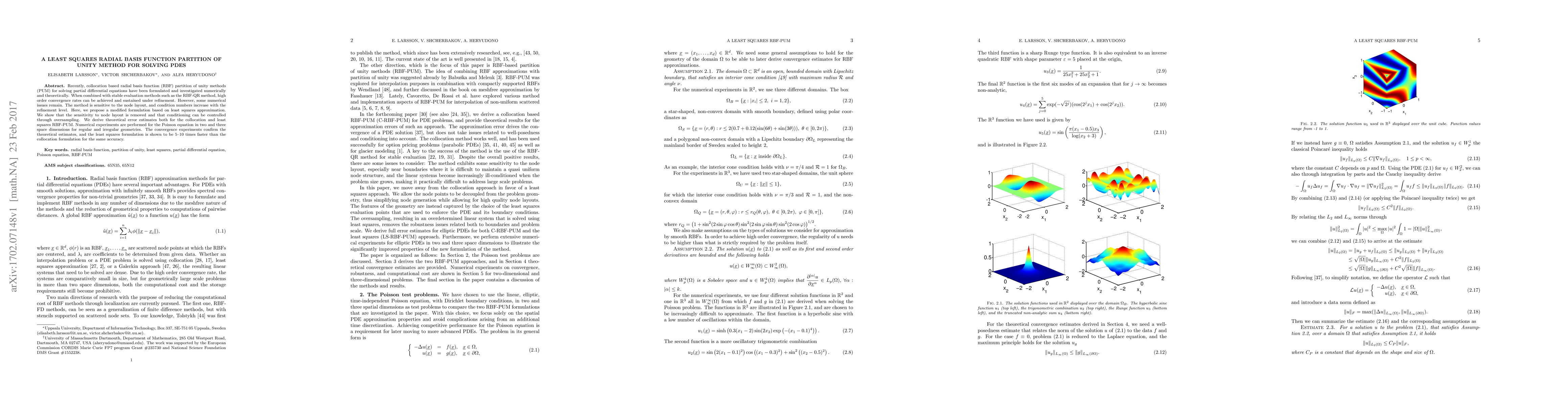 This paper proposes a least squares radial basis function partition of unity method to solve PDEs, addressing numerical issues in the traditional collocation-based approach by removing sensitivity to node layout and controlling conditioning through oversampling, with significantly improved computational efficiency. Theoretical error estimates and numerical experiments confirm the method's effectiveness and convergence.