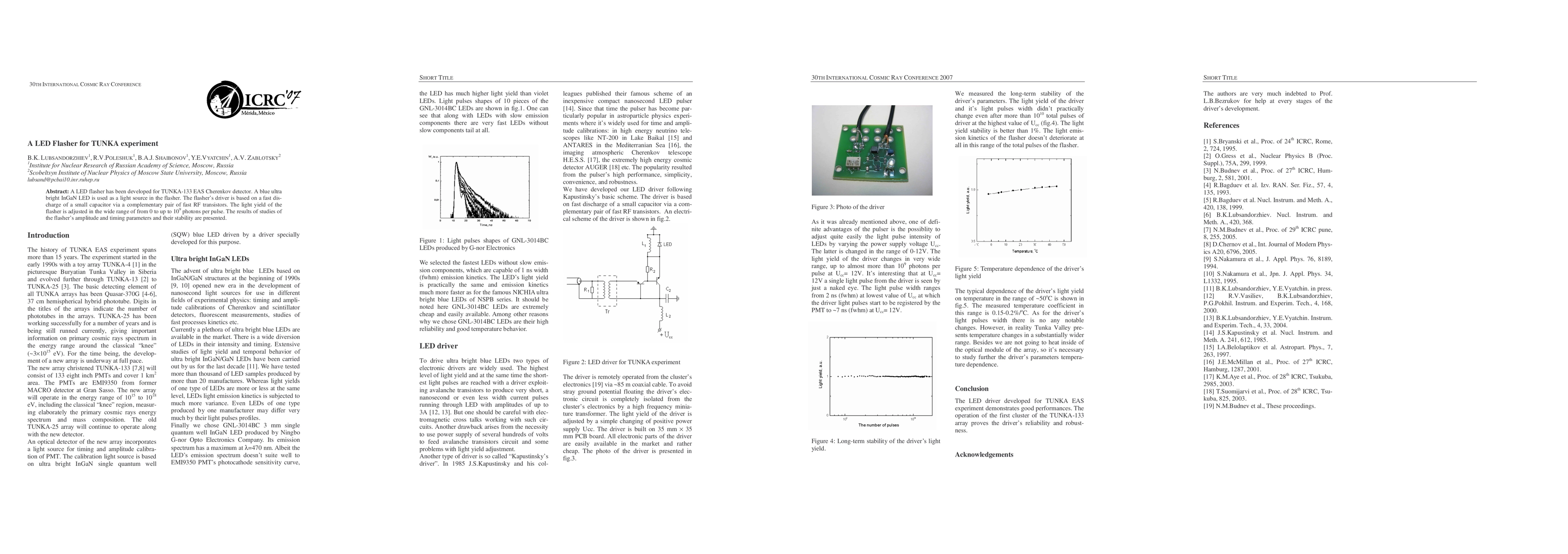 A LED flasher has been developed for TUNKA-133 EAS Cherenkov detector. A blue ultra bright InGaN LED is used as a light source in the flasher. The flasher's driver is based on a fast discharge of a small capacitor via a complementary pair of fast RF transistors. The light yield of the flasher is adjusted in the wide range of from 0 to up to 10**9 photons per pulse. The results of studies of the flasher's amplitude and timing parameters and their stability are presented.