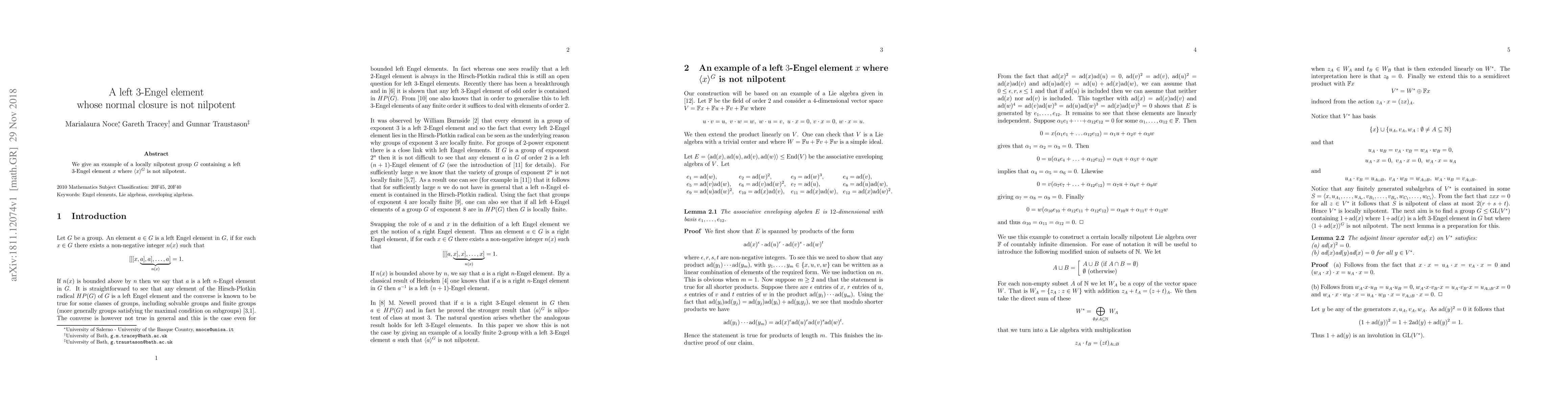 The paper introduces a novel construction of a group G using semidirect products and specific subgroups, demonstrating a left 3-Engel element with a non-nilpotent normal closure in a locally nilpotent group.