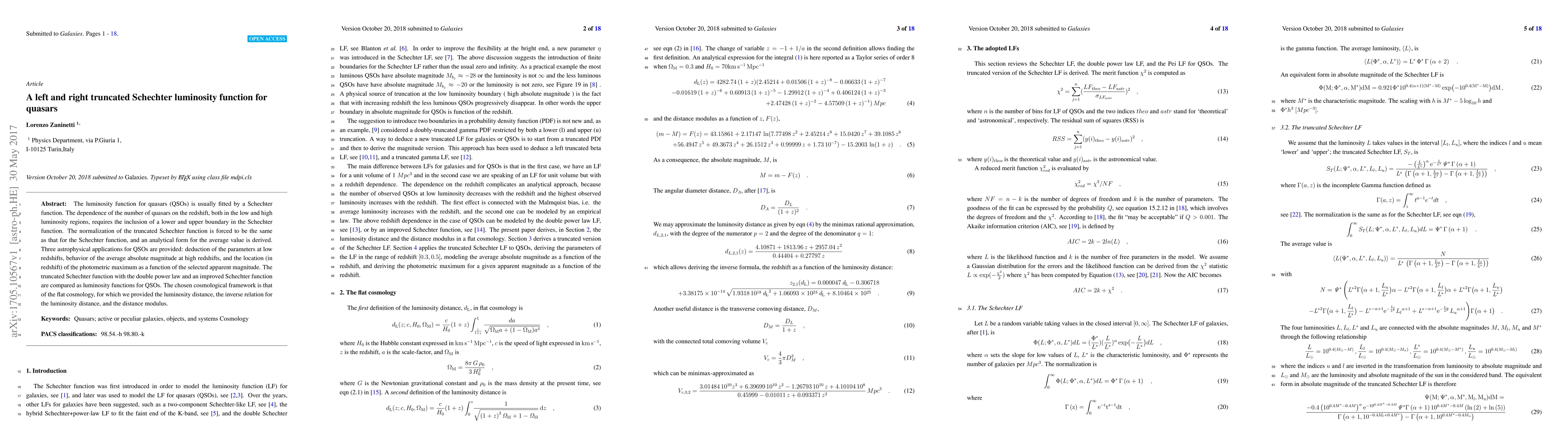 The luminosity function for quasars (QSOs) is usually fitted by a Schechter function. The dependence of the number of quasars on the redshift, both in the low and high luminosity regions, requires the inclusion of a lower and upper boundary in the Schechter function. The normalization of the truncated Schechter function is forced to be the same as that for the Schechter function, and an analytical form for the average value is derived. Three astrophysical applications for QSOs are provided: deduction of the parameters at low redshifts, behavior of the average absolute magnitude at high redshifts, and the location (in redshift) of the photometric maximum as a function of the selected apparent magnitude. The truncated Schechter function with the double power law and an improved Schechter function are compared as luminosity functions for QSOs. The chosen cosmological framework is that of the flat cosmology, for which we provided the luminosity distance, the inverse relation for the luminosity distance, and the distance modulus.